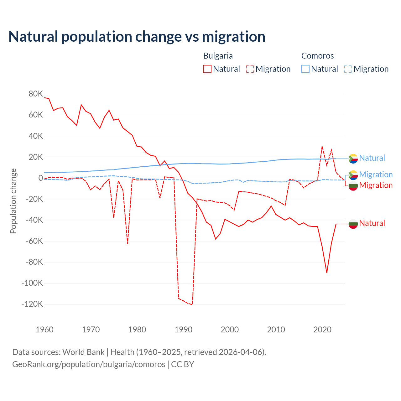 Over the last 10 years, 92.1% of the population change in Bulgaria is from natural causes (a loss of 528,535 people) and 7.94% is from migration (a gain of 45,567 people). In Comoros 87.9% is from natural causes (a gain of 179,319 people) and 12.1% is from migration (a loss of 24,709 people).