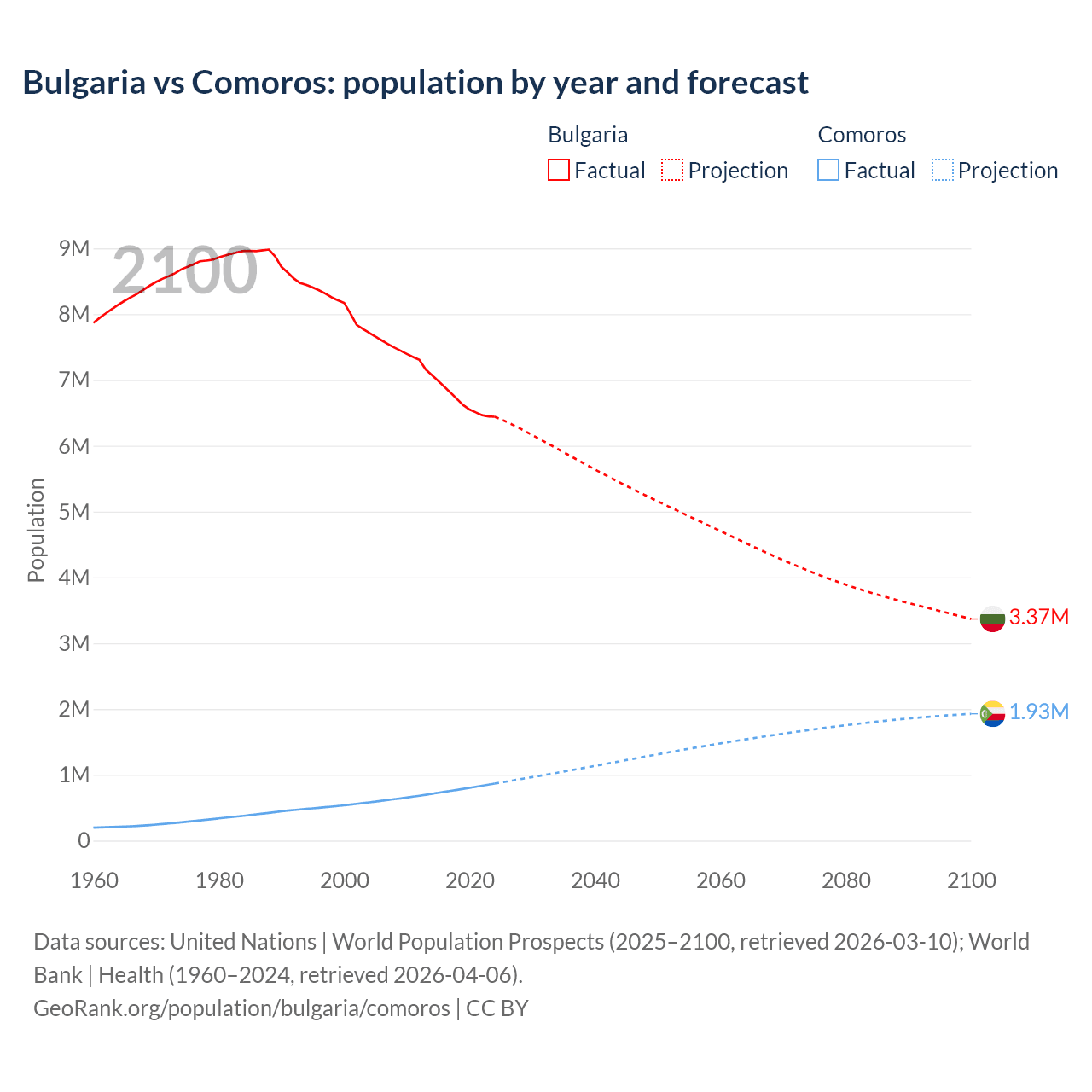 The latest officially reported population of Bulgaria was 6,441,421 in 2024 vs 866,628 people in Comoros in 2024. In 2026, based on the adjusted UN estimation, the current Bulgaria's population is 6,359,449 people compared to 903,776 in Comoros.
