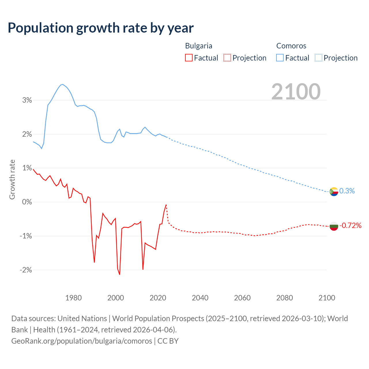 - For the last 10 years, Bulgaria has had an average growth rate of -0.96% per year vs +2.01% in Comoros.