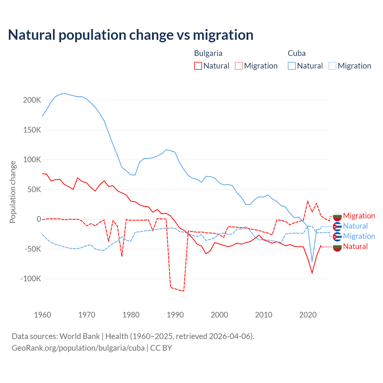 Over the last 10 years, 92.1% of the population change in Bulgaria is from natural causes (a loss of 528,535 people) and 7.94% is from migration (a gain of 45,567 people). In Cuba 21.9% is from natural causes (a loss of 64,179 people) and 78.1% is from migration (a loss of 229,508 people).