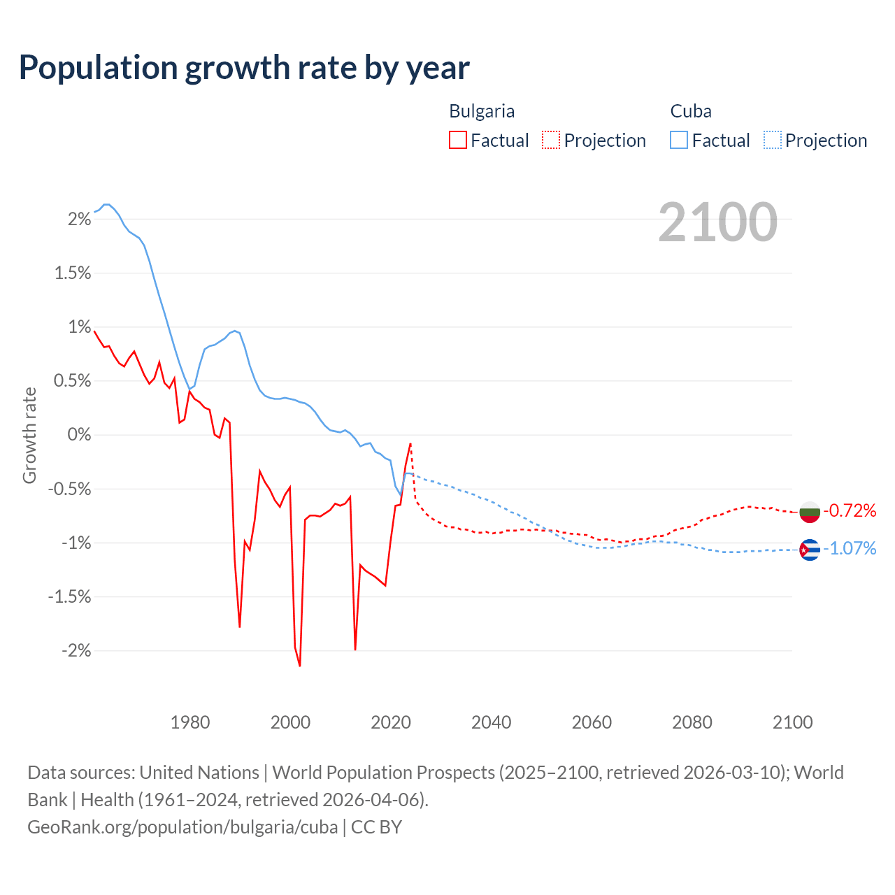 - For the last 10 years, Bulgaria has had an average growth rate of -0.96% per year vs -0.26% in Cuba.