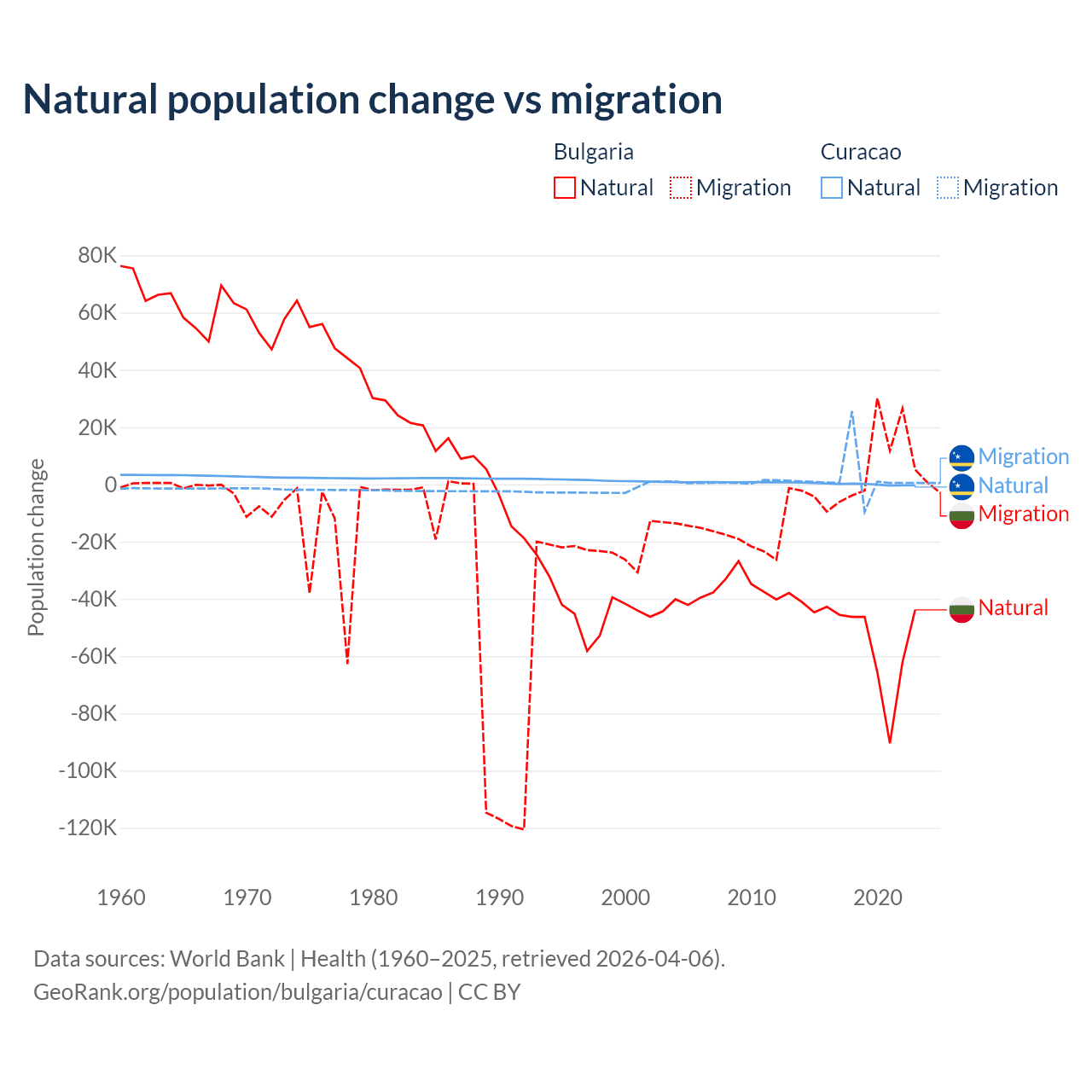 Over the last 10 years, 92.1% of the population change in Bulgaria is from natural causes (a loss of 528,535 people) and 7.94% is from migration (a gain of 45,567 people). In Curacao 3.72% is from natural causes (a gain of 834 people) and 96.3% is from migration (a gain of 21,615 people).