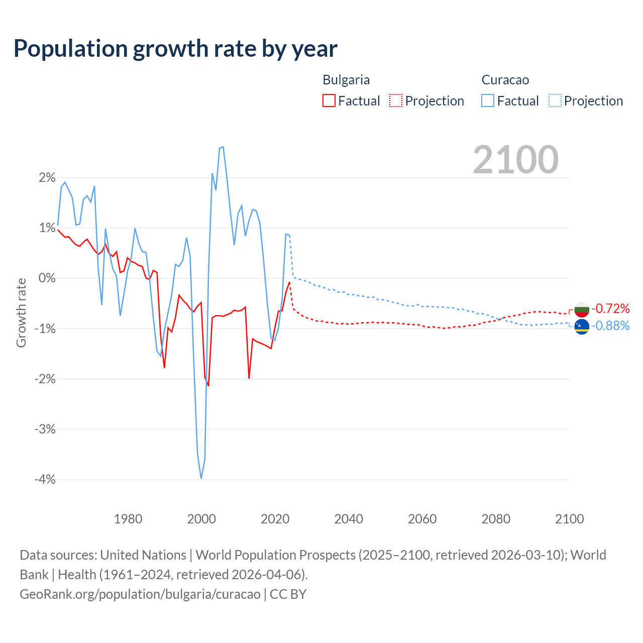 - For the last 10 years, Bulgaria has had an average growth rate of -0.96% per year vs +0.13% in Curacao.