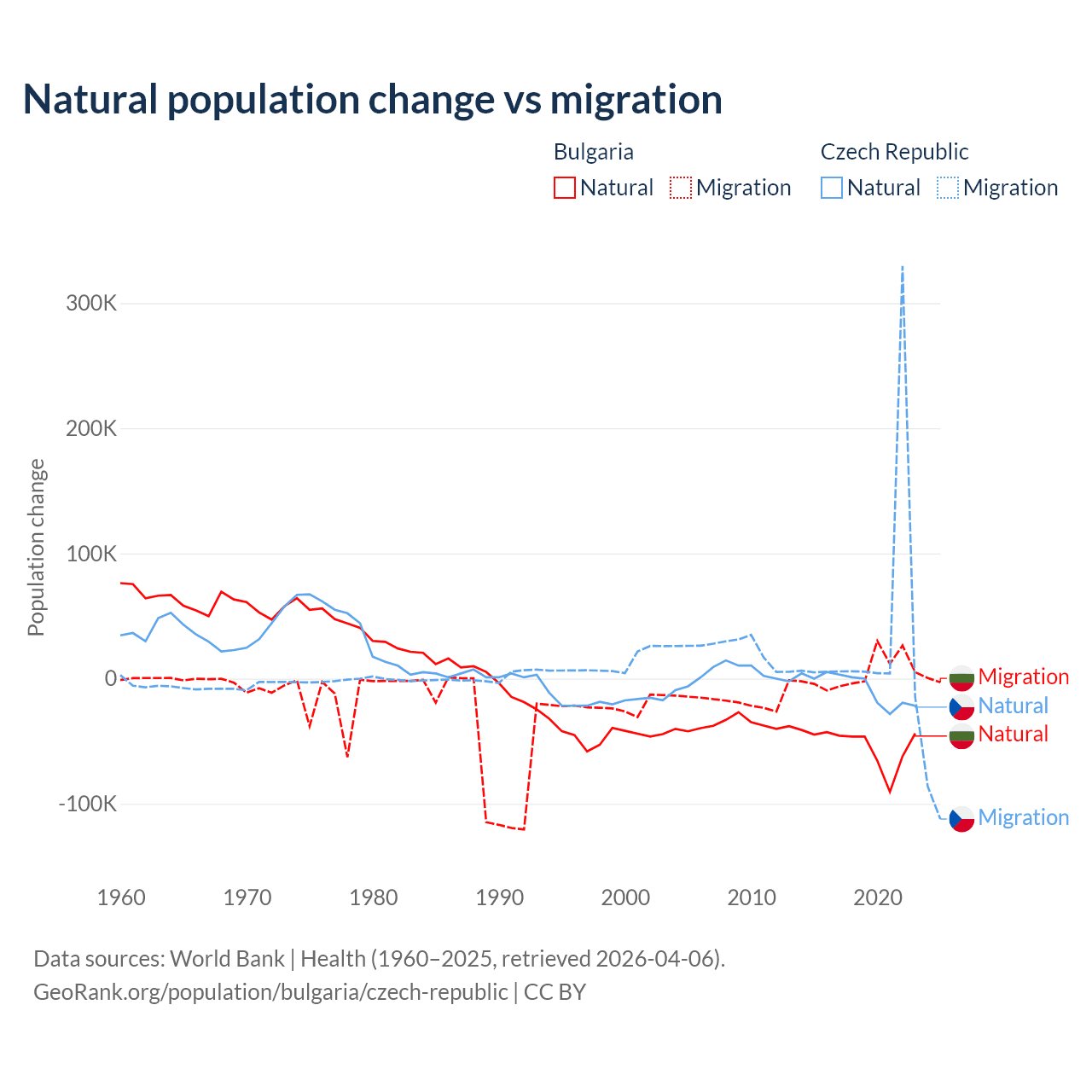 Over the last 10 years, 92.1% of the population change in Bulgaria is from natural causes (a loss of 528,535 people) and 7.94% is from migration (a gain of 45,567 people). In the Czech Republic 17.3% is from natural causes (a loss of 74,826 people) and 82.7% is from migration (a gain of 357,502 people).