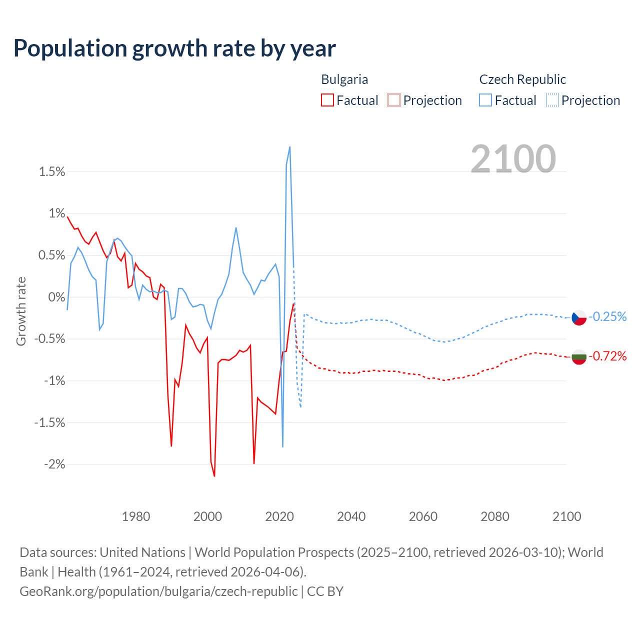 - For the last 10 years, Bulgaria has had an average growth rate of -0.96% per year vs +0.34% in the Czech Republic.