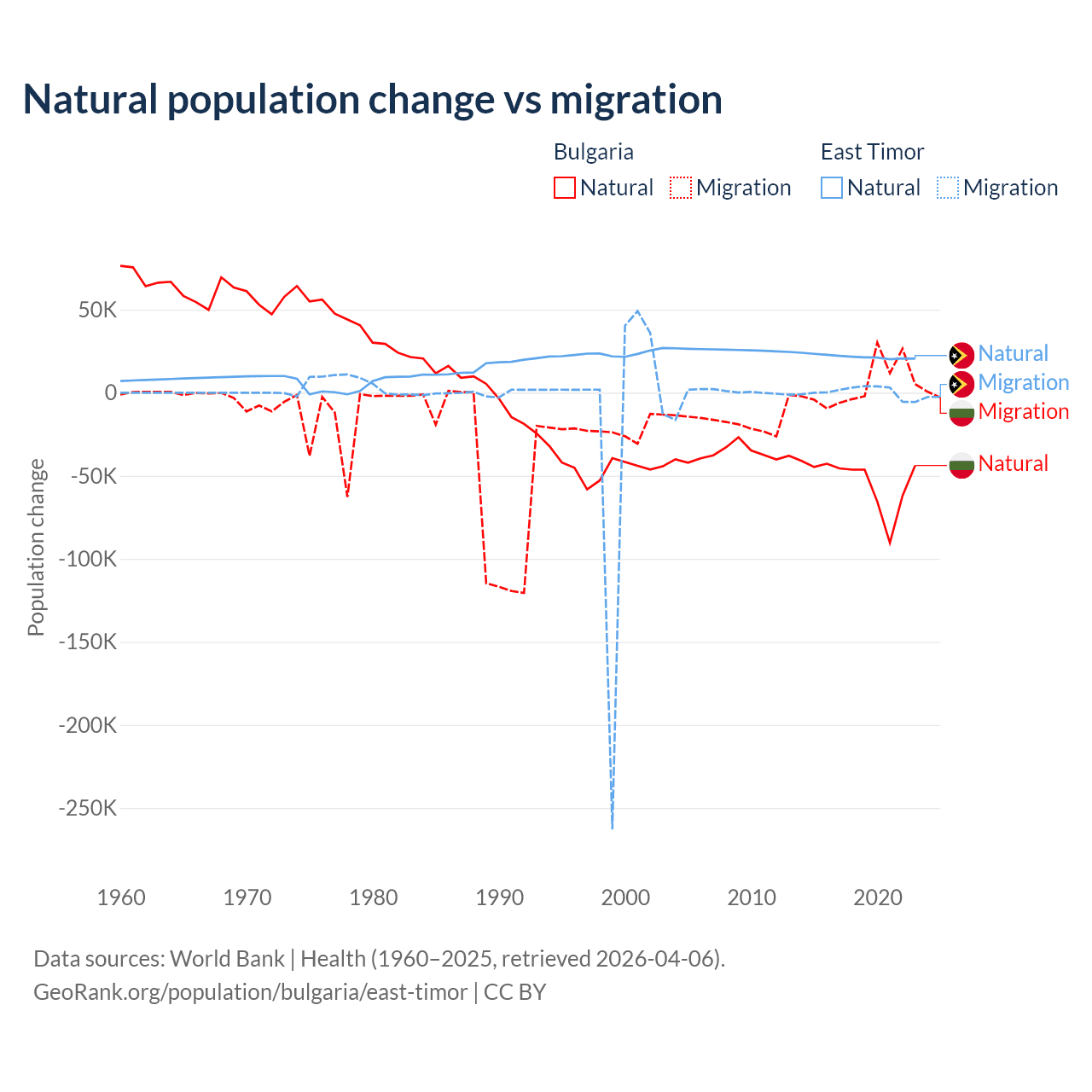 Over the last 10 years, 92.1% of the population change in Bulgaria is from natural causes (a loss of 528,535 people) and 7.94% is from migration (a gain of 45,567 people). In East Timor 98.3% is from natural causes (a gain of 217,698 people) and 1.66% is from migration (a gain of 3,665 people).
