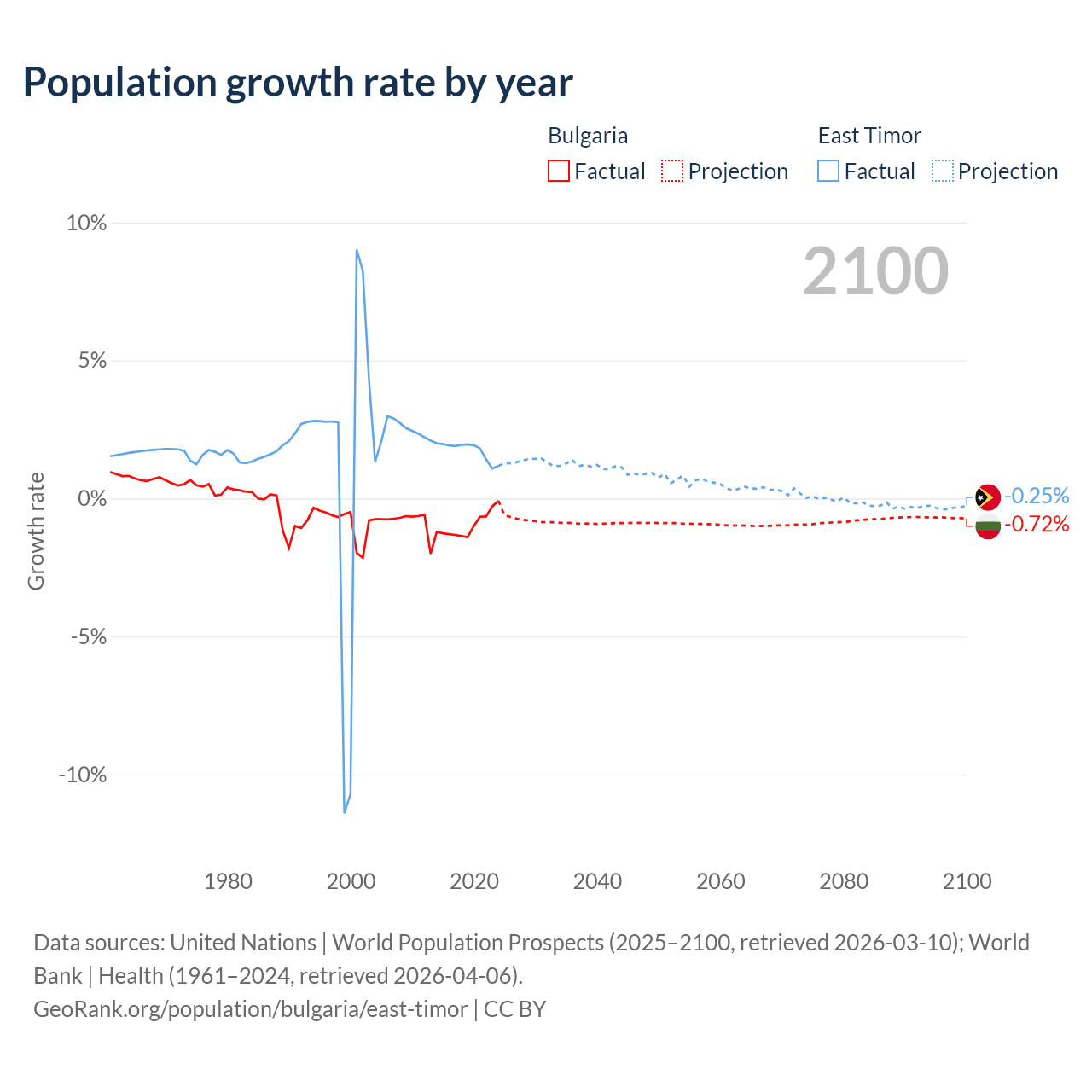 - For the last 10 years, Bulgaria has had an average growth rate of -0.96% per year vs +1.74% in East Timor.
