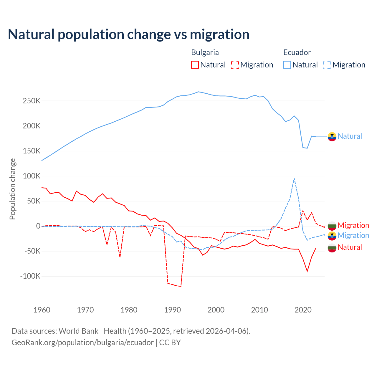 Over the last 10 years, 92.1% of the population change in Bulgaria is from natural causes (a loss of 528,535 people) and 7.94% is from migration (a gain of 45,567 people). In Ecuador 91.9% is from natural causes (a gain of 1,964,352 people) and 8.08% is from migration (a gain of 172,707 people).