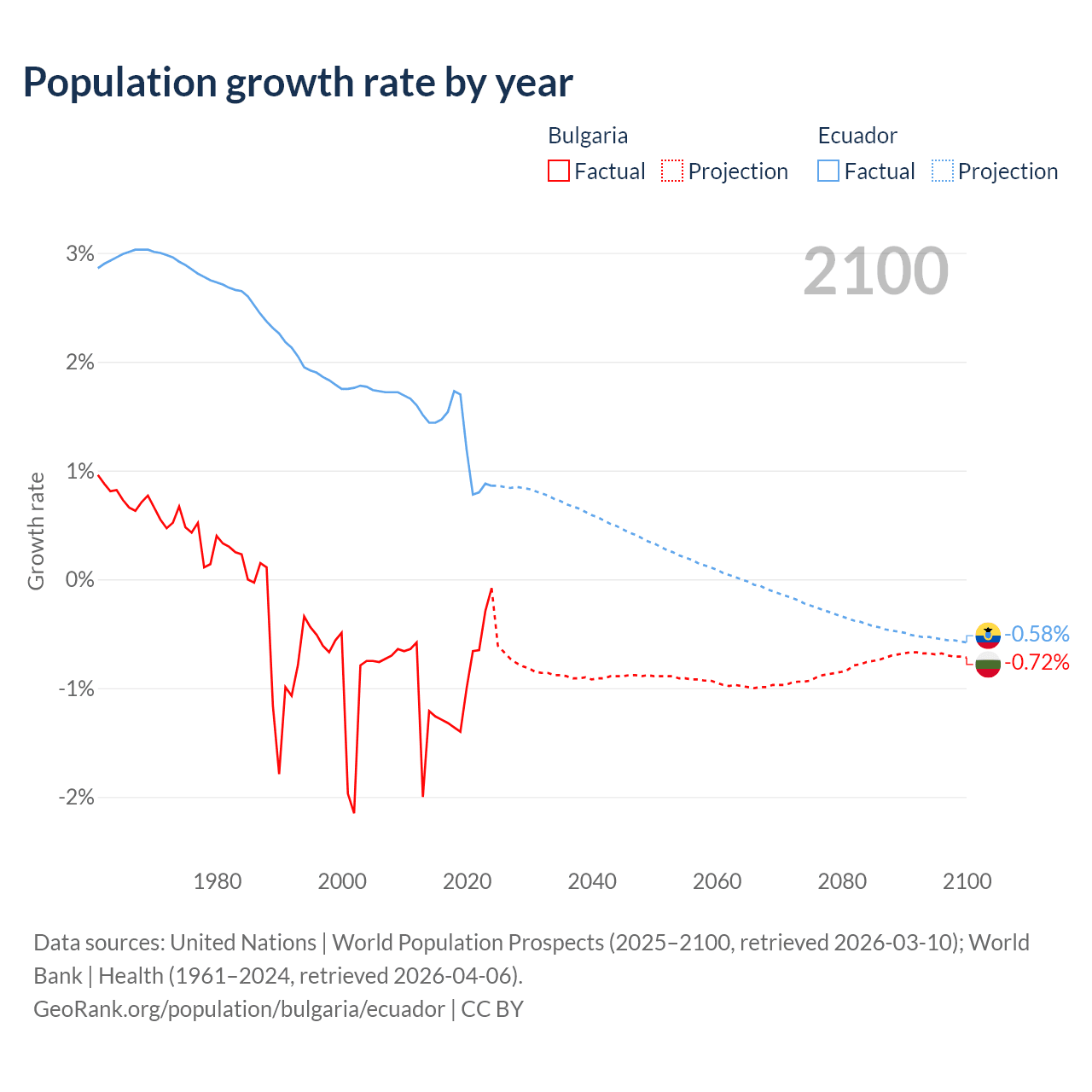 - For the last 10 years, Bulgaria has had an average growth rate of -0.96% per year vs +1.26% in Ecuador.