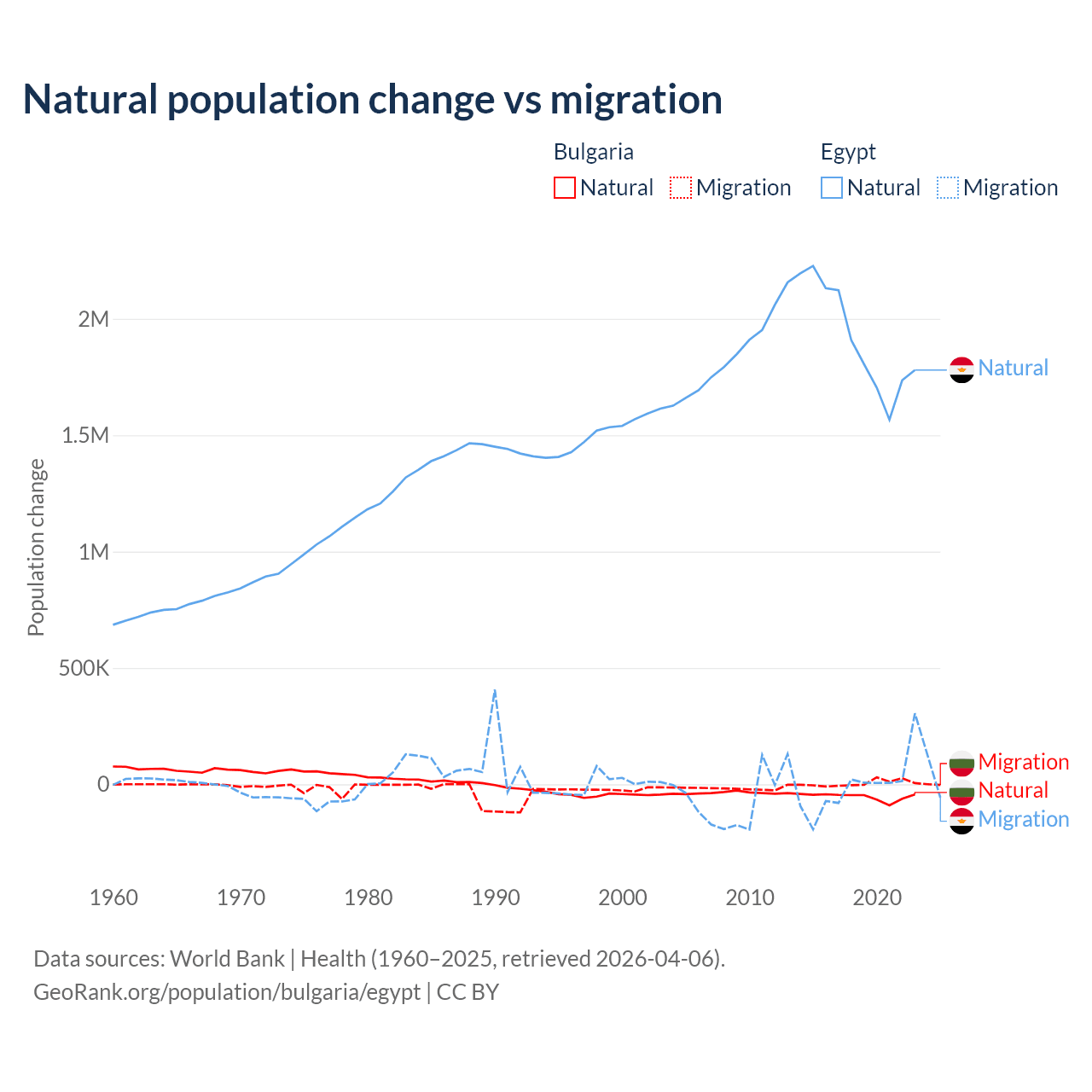 Over the last 10 years, 92.1% of the population change in Bulgaria is from natural causes (a loss of 528,535 people) and 7.94% is from migration (a gain of 45,567 people). In Egypt 99.6% is from natural causes (a gain of 19,180,073 people) and 0.41% is from migration (a loss of 78,975 people).