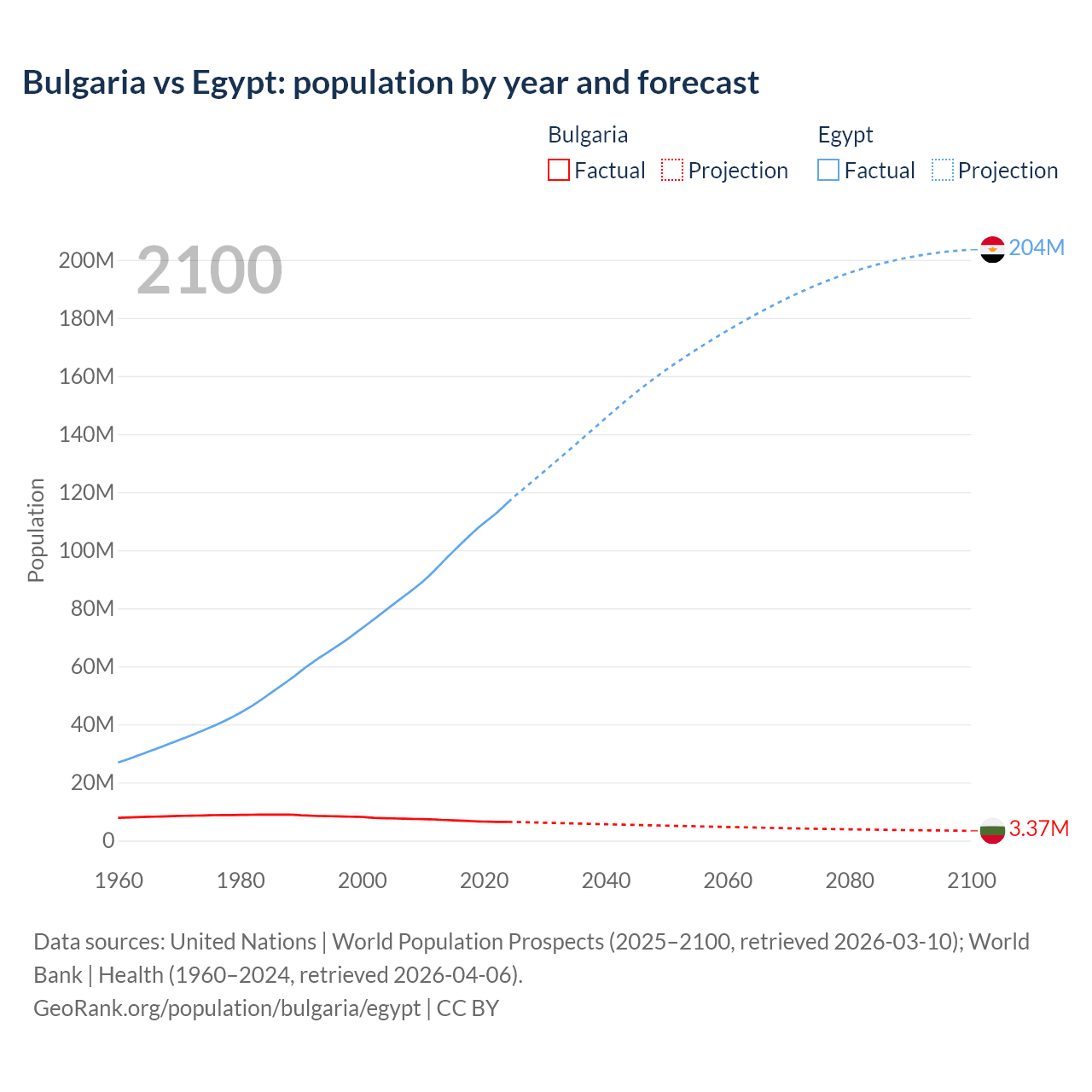 Bulgaria vs Egypt: population by year and forecast