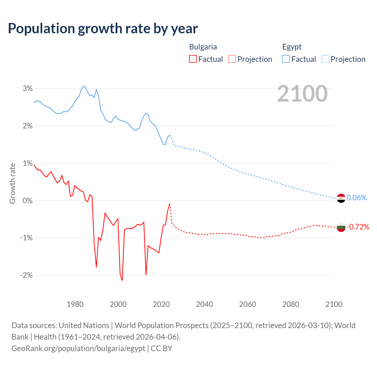 - For the last 10 years, Bulgaria has had an average growth rate of -0.96% per year vs +1.84% in Egypt.