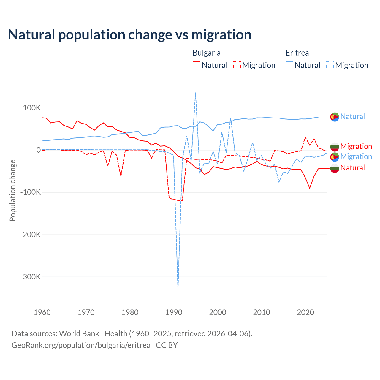 Over the last 10 years, 92.1% of the population change in Bulgaria is from natural causes (a loss of 528,535 people) and 7.94% is from migration (a gain of 45,567 people). In Eritrea 68.8% is from natural causes (a gain of 742,837 people) and 31.2% is from migration (a loss of 336,243 people).