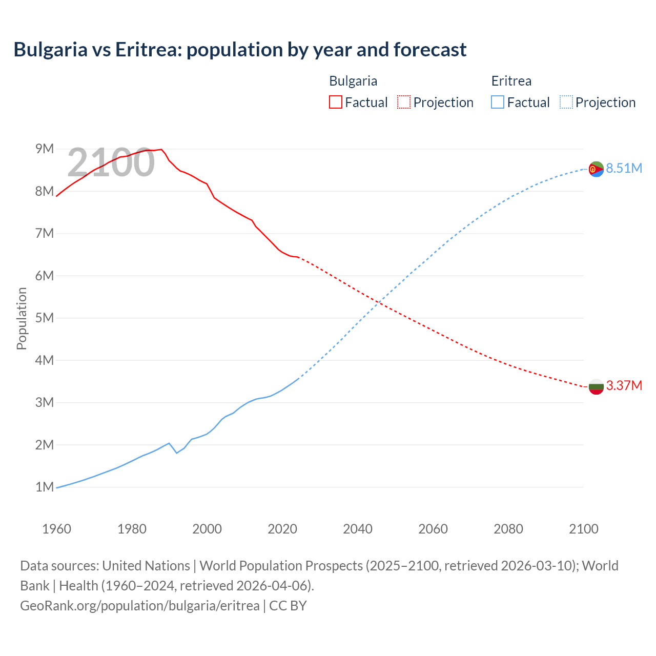 Bulgaria vs Eritrea: population by year and forecast