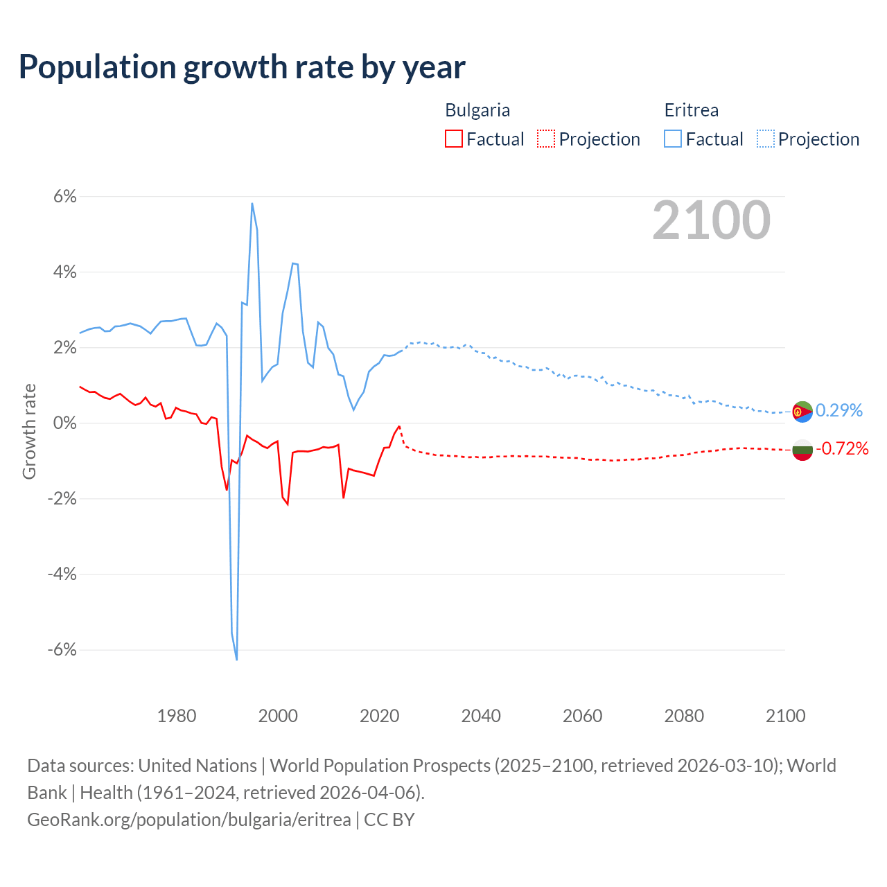 - For the last 10 years, Bulgaria has had an average growth rate of -0.96% per year vs +1.28% in Eritrea.