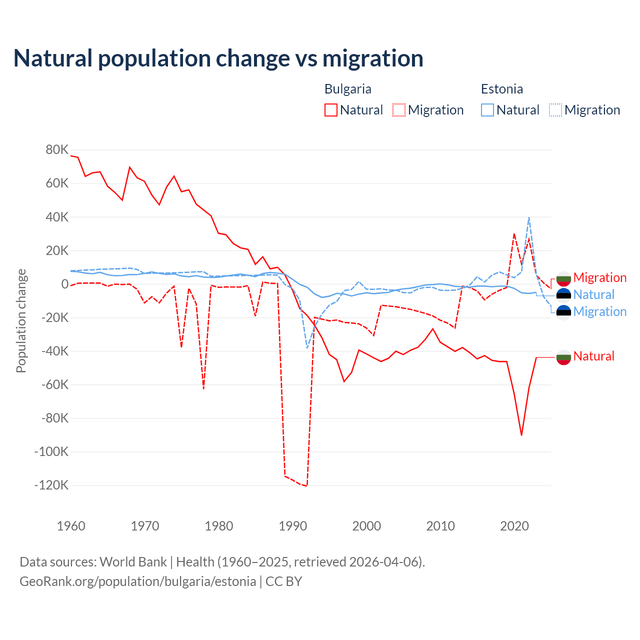 Over the last 10 years, 92.1% of the population change in Bulgaria is from natural causes (a loss of 528,535 people) and 7.94% is from migration (a gain of 45,567 people). In Estonia 26.1% is from natural causes (a loss of 27,683 people) and 73.9% is from migration (a gain of 78,553 people).