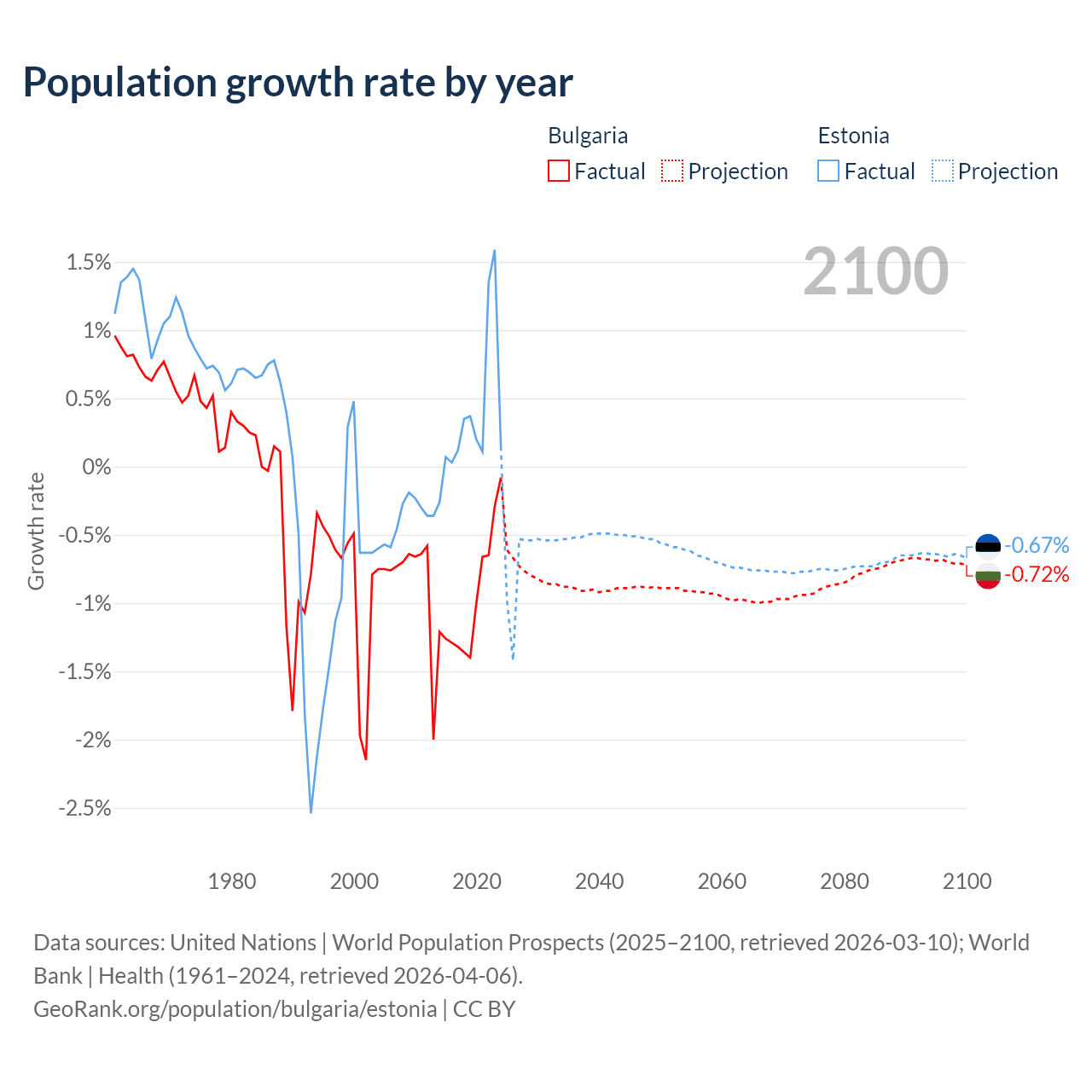- For the last 10 years, Bulgaria has had an average growth rate of -0.96% per year vs +0.37% in Estonia.