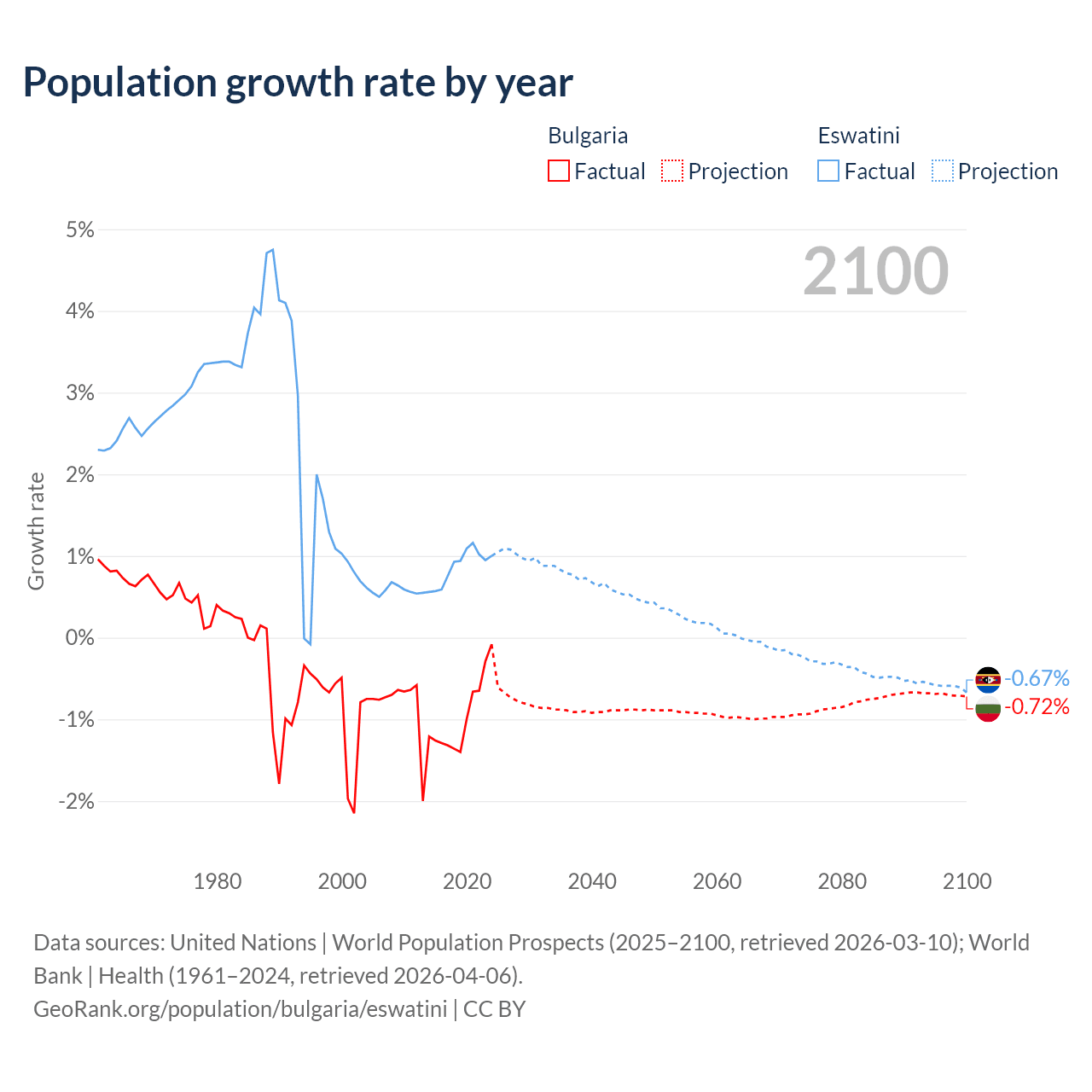 - For the last 10 years, Bulgaria has had an average growth rate of -0.96% per year vs +0.87% in Eswatini.