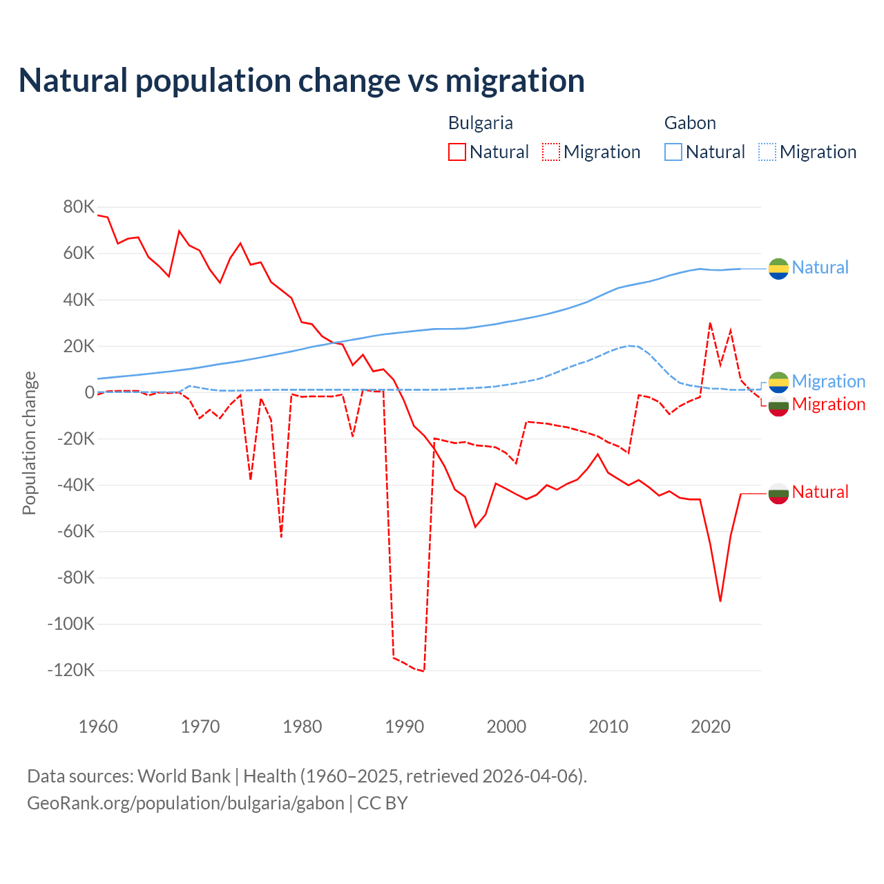 Over the last 10 years, 92.1% of the population change in Bulgaria is from natural causes (a loss of 528,535 people) and 7.94% is from migration (a gain of 45,567 people). In Gabon 91.1% is from natural causes (a gain of 515,484 people) and 8.86% is from migration (a gain of 50,119 people).