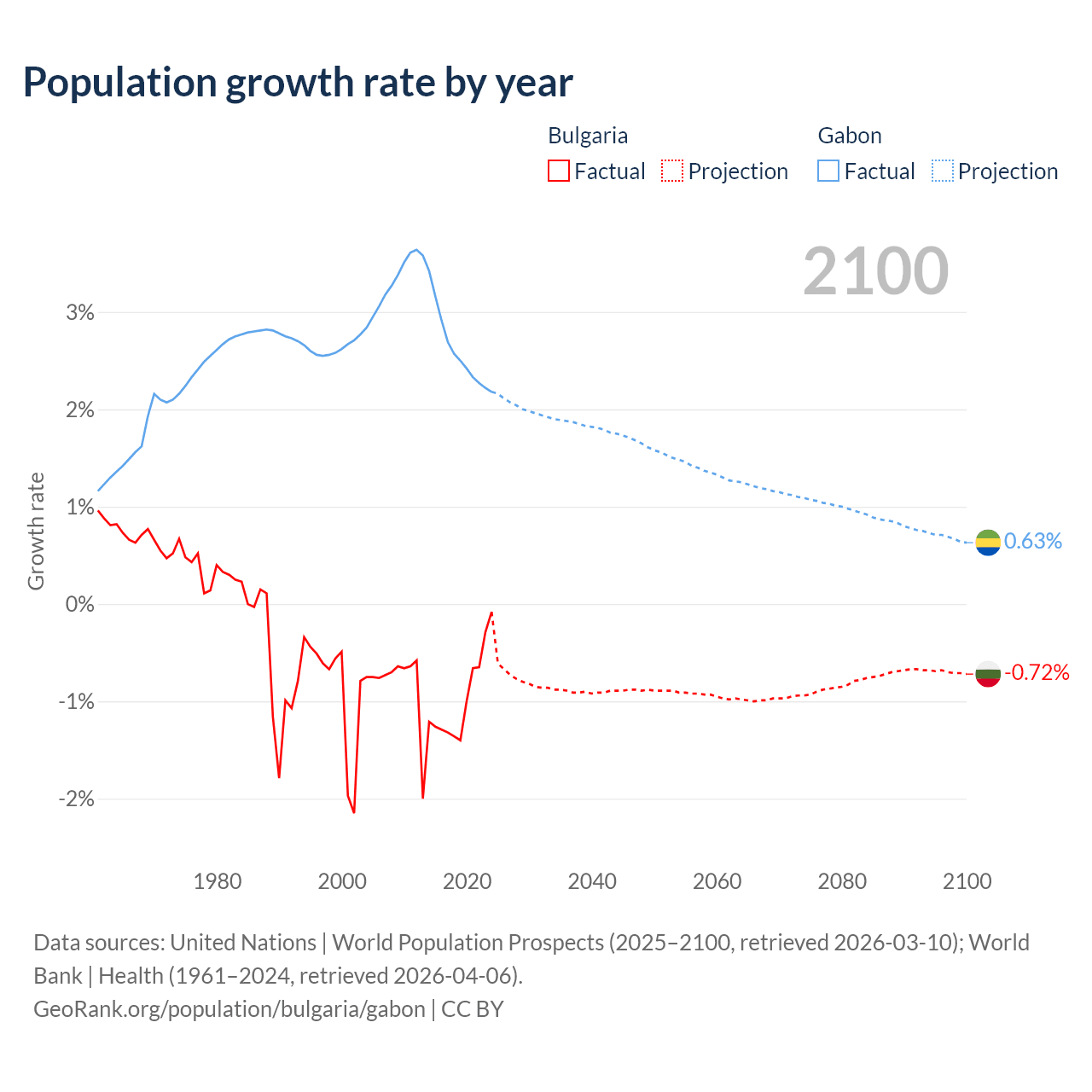 - For the last 10 years, Bulgaria has had an average growth rate of -0.96% per year vs +2.61% in Gabon.