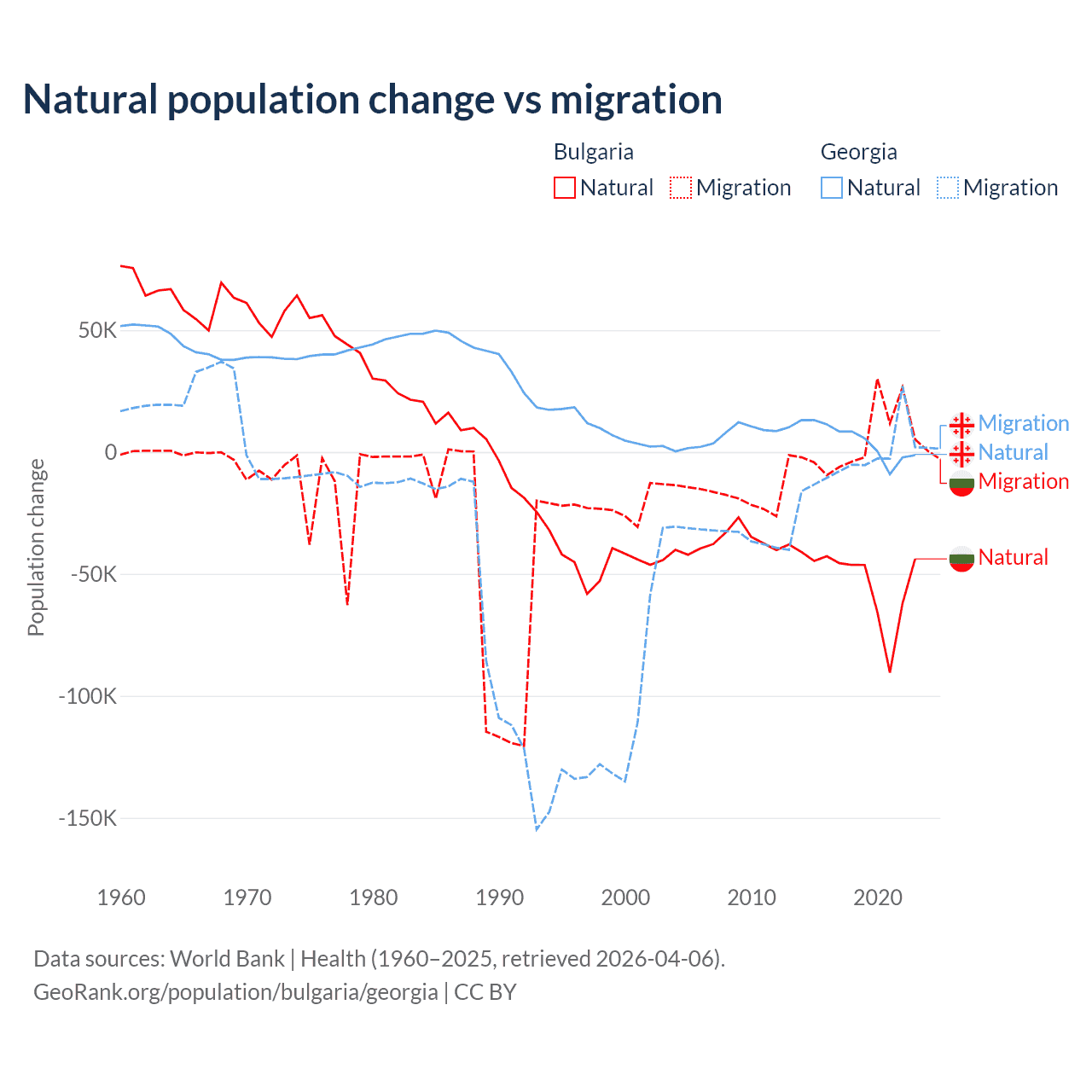 Over the last 10 years, 92.1% of the population change in Bulgaria is from natural causes (a loss of 528,535 people) and 7.94% is from migration (a gain of 45,567 people). In Georgia 57.7% is from natural causes (a gain of 47,646 people) and 42.3% is from migration (a loss of 34,907 people).