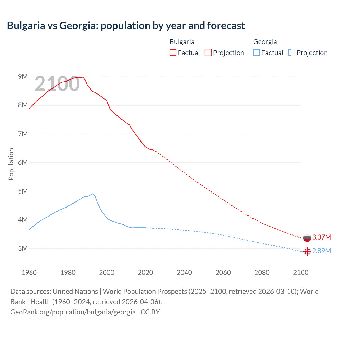 Bulgaria vs Georgia: population by year and forecast