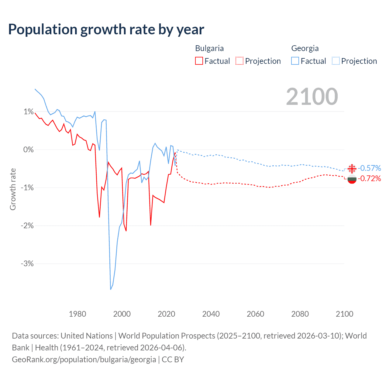 - For the last 10 years, Bulgaria has had an average growth rate of -0.96% per year vs -0.04% in Georgia.