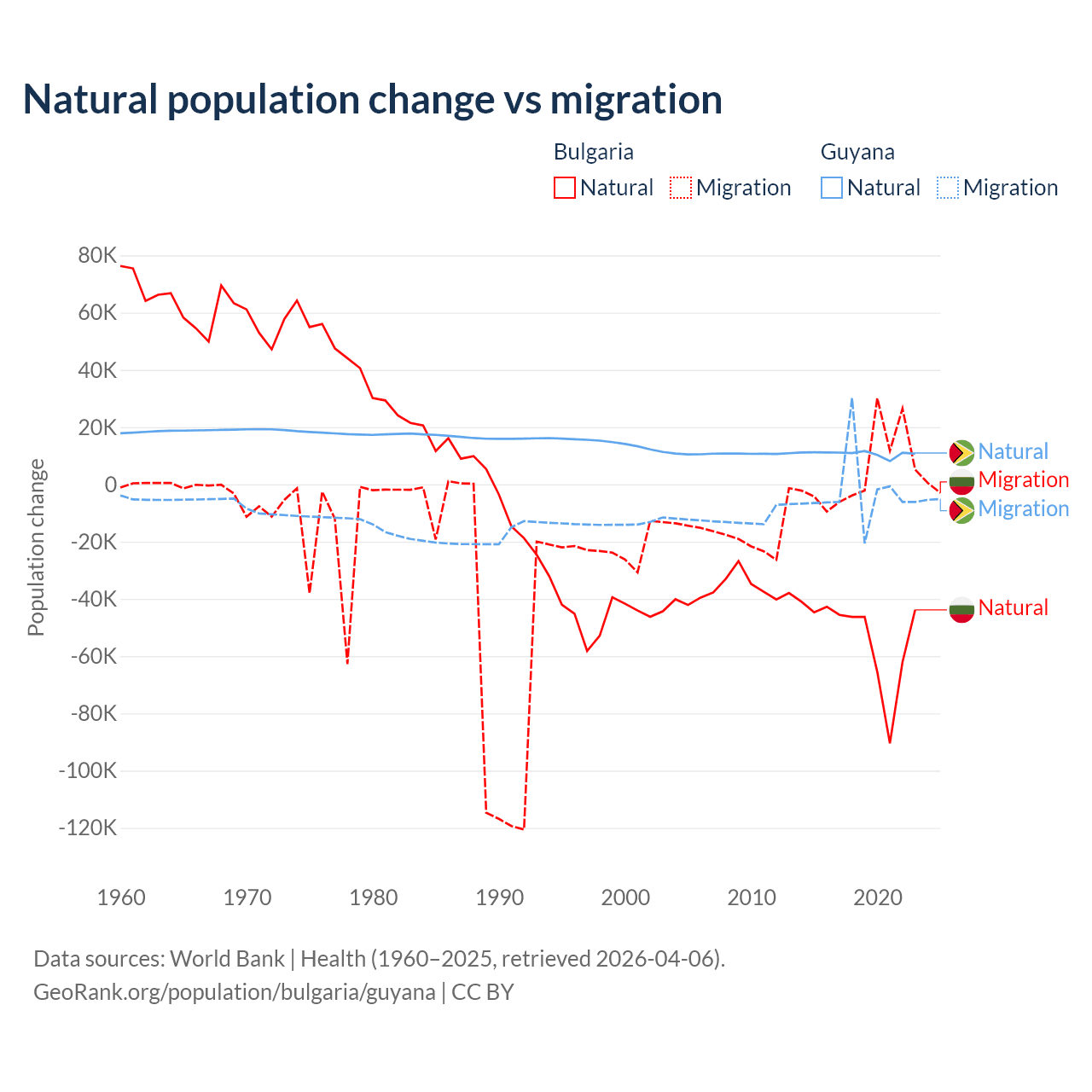 Over the last 10 years, 92.1% of the population change in Bulgaria is from natural causes (a loss of 528,535 people) and 7.94% is from migration (a gain of 45,567 people). In Guyana 77.7% is from natural causes (a gain of 107,419 people) and 22.3% is from migration (a loss of 30,797 people).
