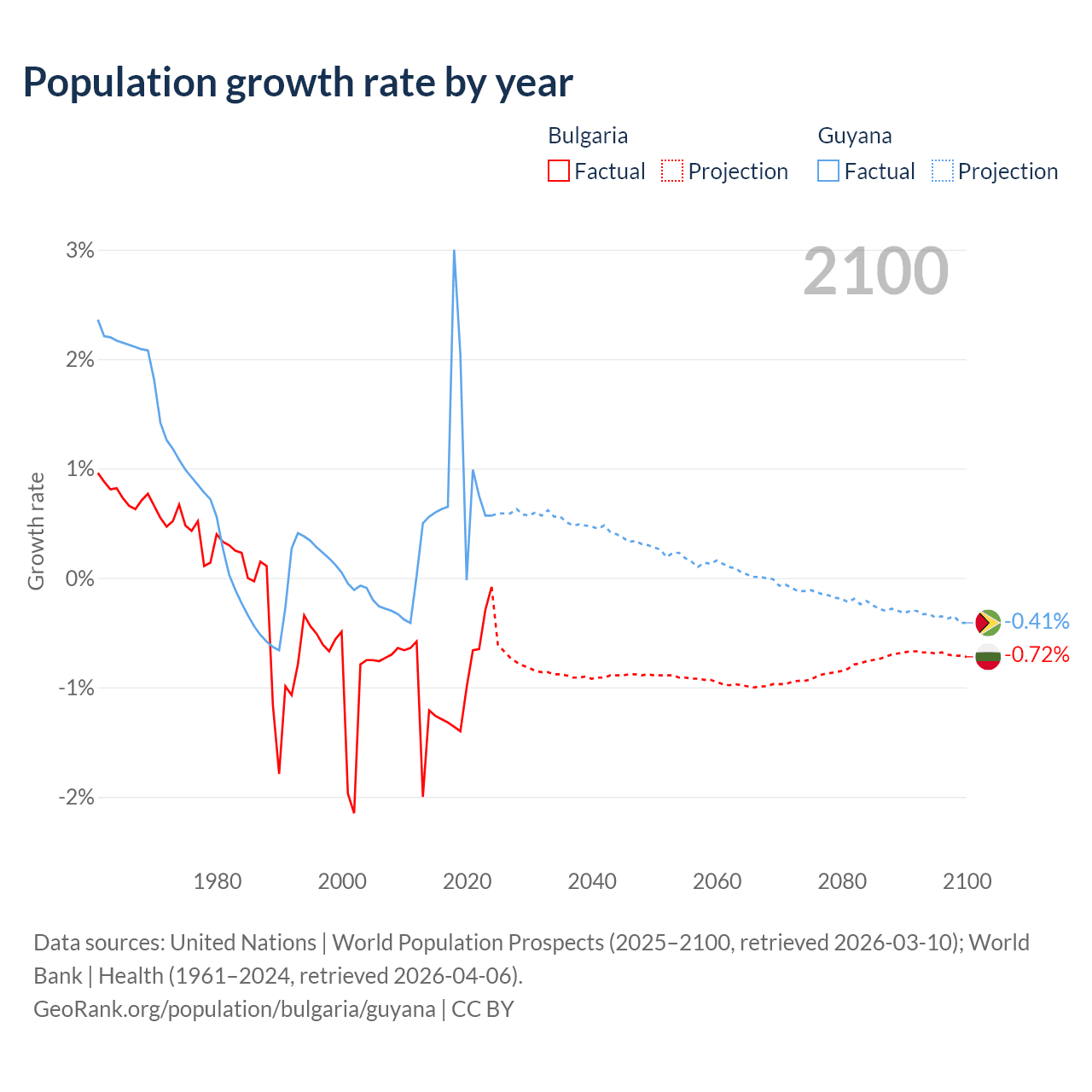 - For the last 10 years, Bulgaria has had an average growth rate of -0.96% per year vs +0.94% in Guyana.