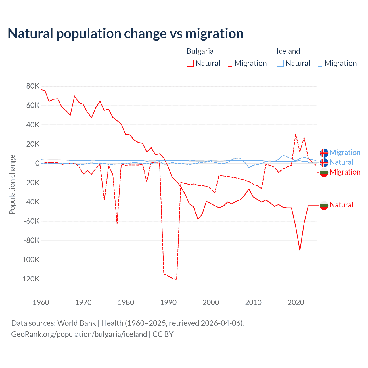 Over the last 10 years, 92.1% of the population change in Bulgaria is from natural causes (a loss of 528,535 people) and 7.94% is from migration (a gain of 45,567 people). In Iceland 30.7% is from natural causes (a gain of 20,128 people) and 69.3% is from migration (a gain of 45,356 people).