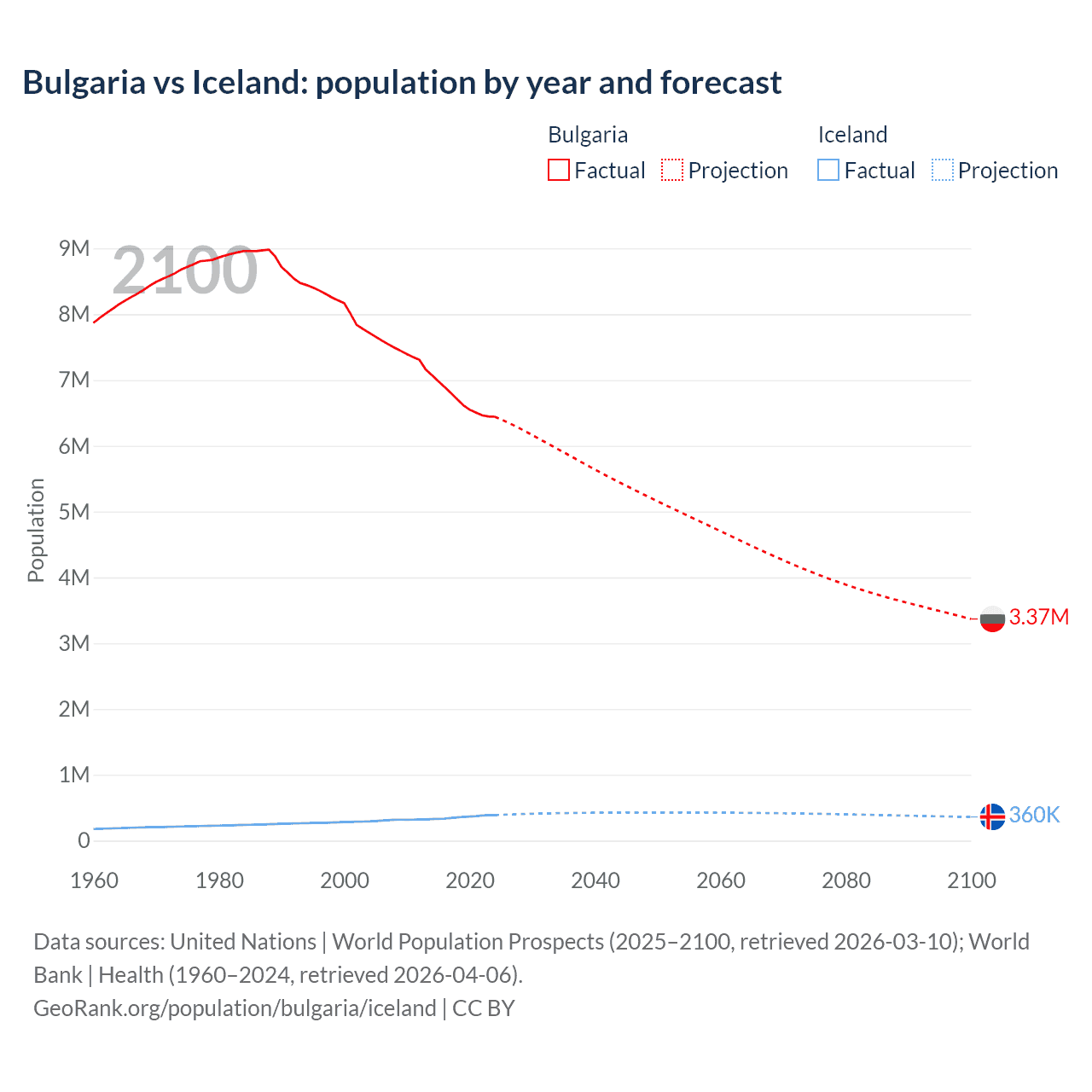 Bulgaria vs Iceland: population by year and forecast