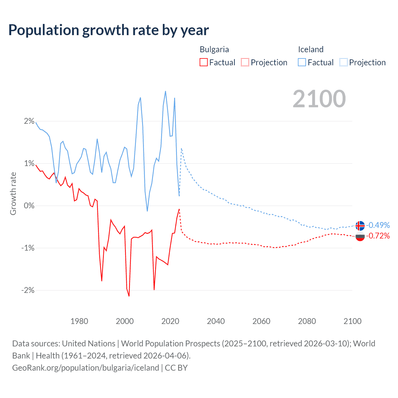 - For the last 10 years, Bulgaria has had an average growth rate of -0.96% per year vs +1.63% in Iceland.
