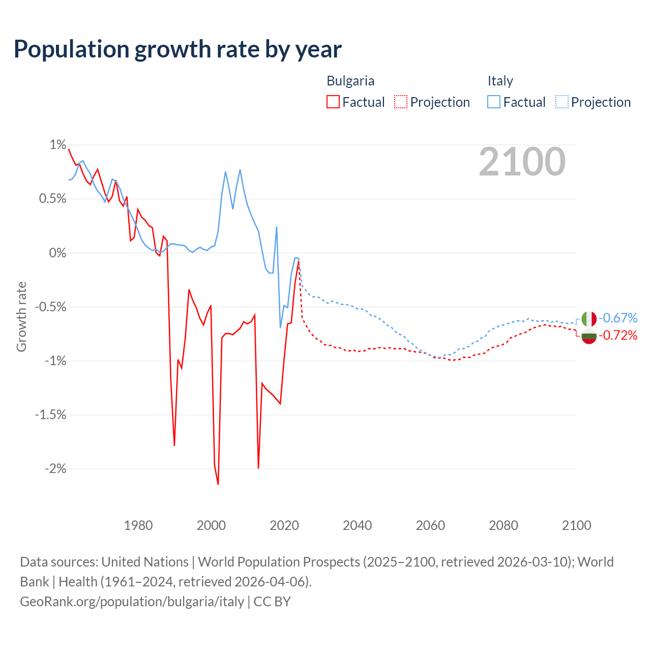 - For the last 10 years, Bulgaria has had an average growth rate of -0.96% per year vs -0.21% in Italy.