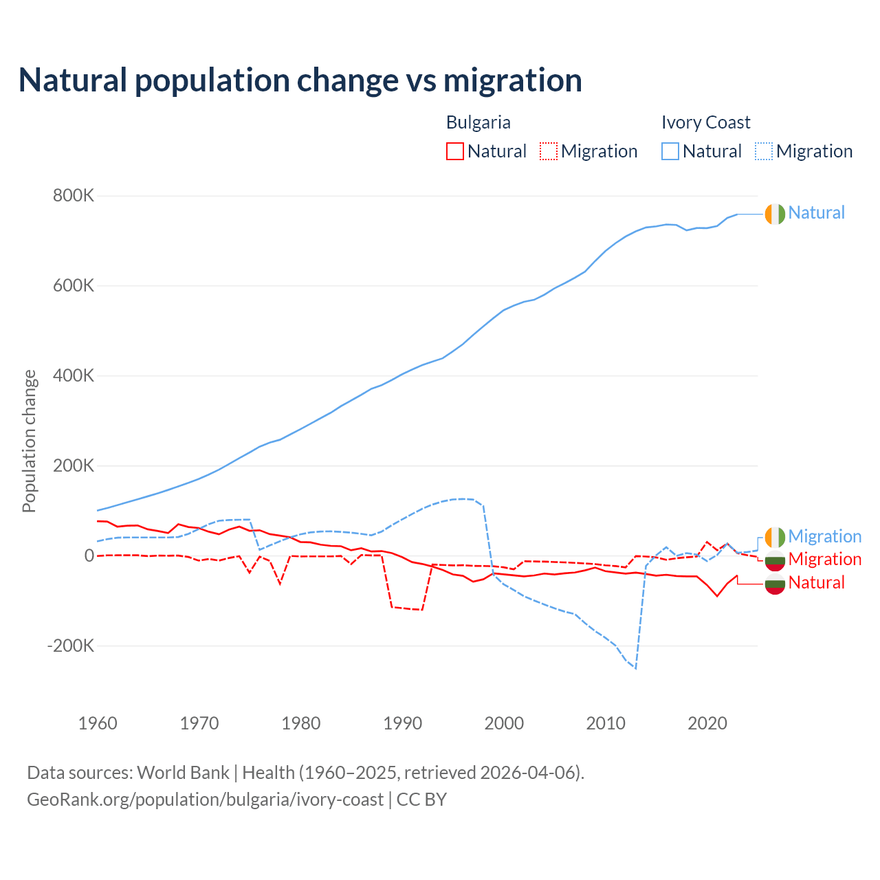Over the last 10 years, 92.1% of the population change in Bulgaria is from natural causes (a loss of 528,535 people) and 7.94% is from migration (a gain of 45,567 people). In Ivory Coast 99.7% is from natural causes (a gain of 7,348,944 people) and 0.33% is from migration (a gain of 24,432 people).