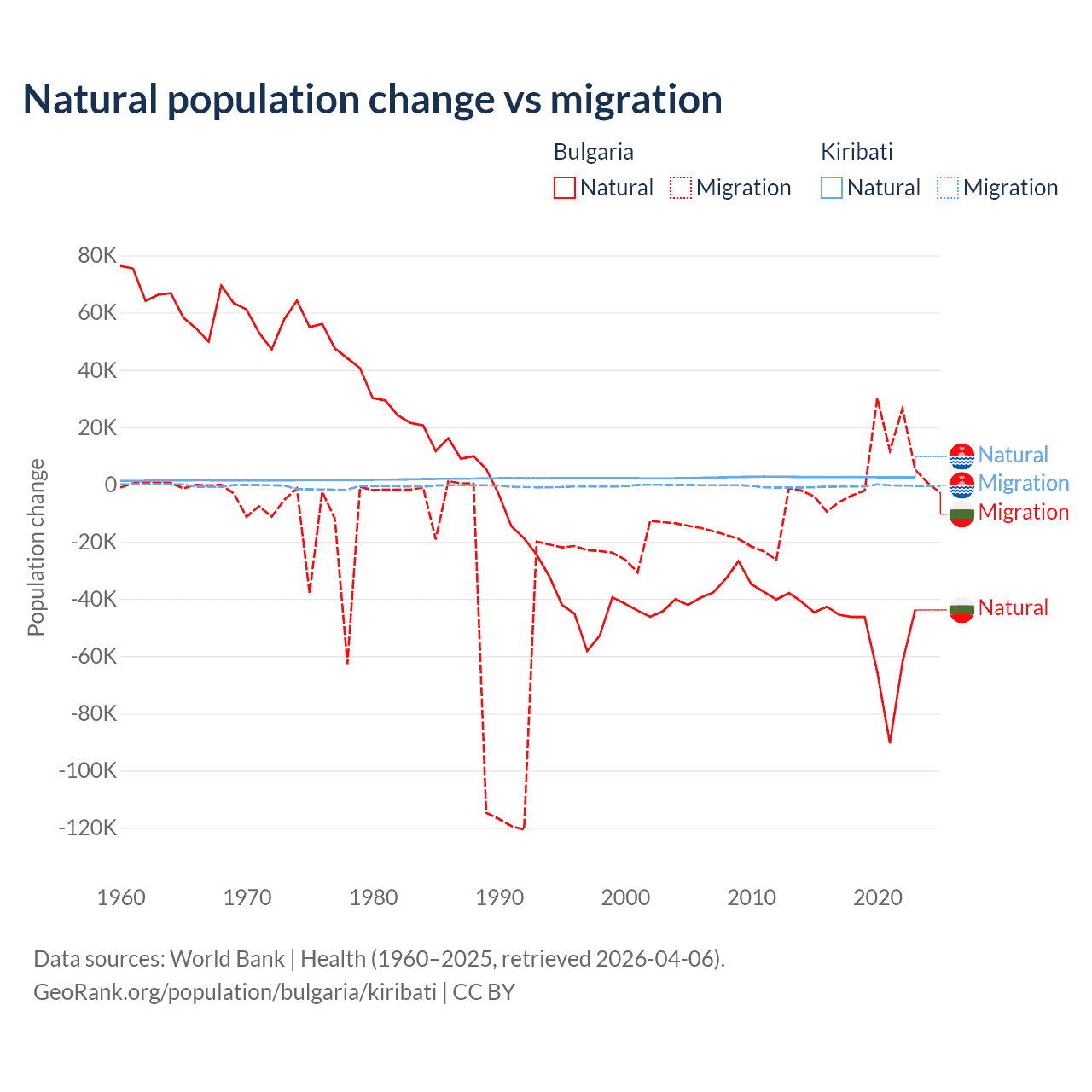 Over the last 10 years, 92.1% of the population change in Bulgaria is from natural causes (a loss of 528,535 people) and 7.94% is from migration (a gain of 45,567 people). In Kiribati 80% is from natural causes (a gain of 25,262 people) and 20% is from migration (a loss of 6,330 people).