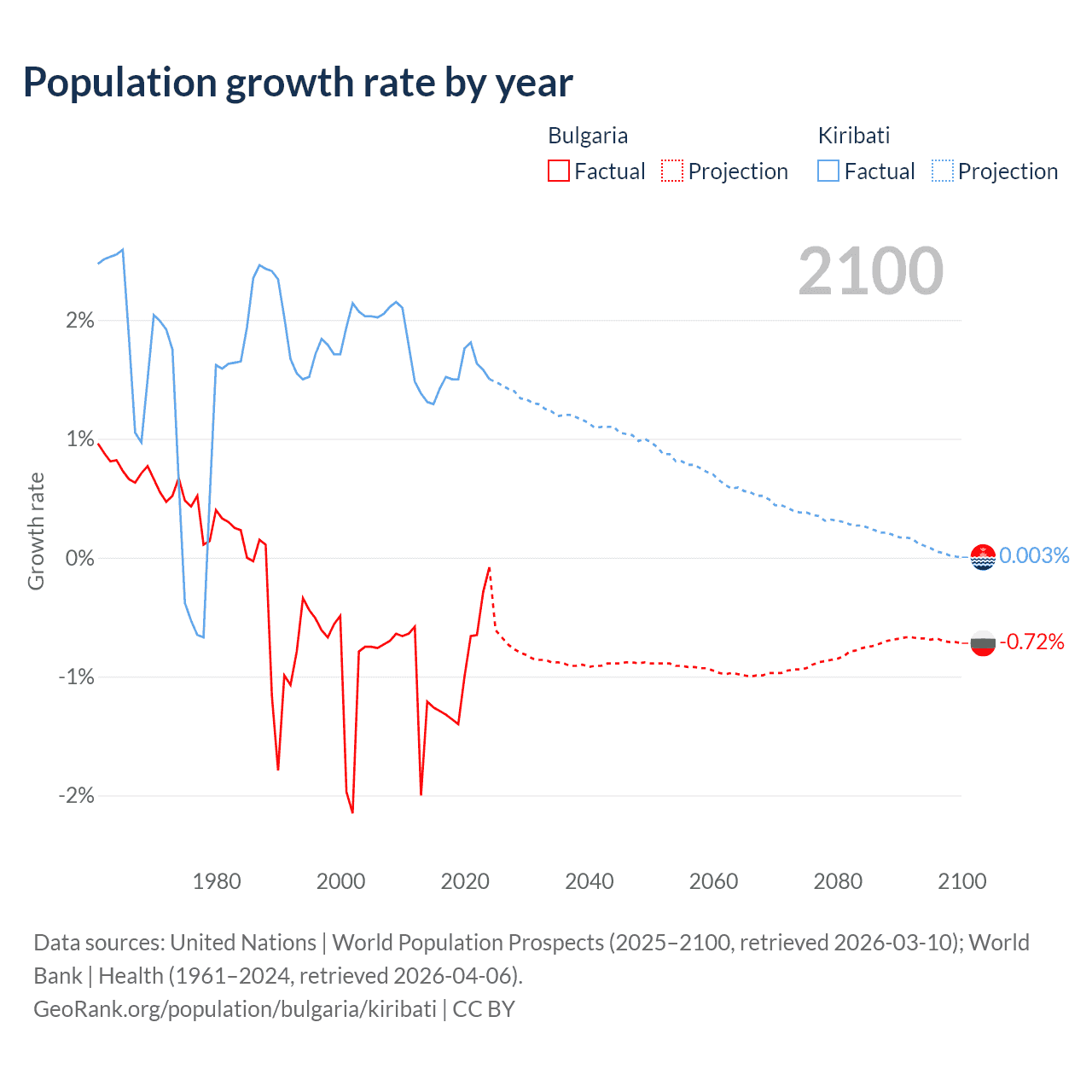 - For the last 10 years, Bulgaria has had an average growth rate of -0.96% per year vs +1.53% in Kiribati.