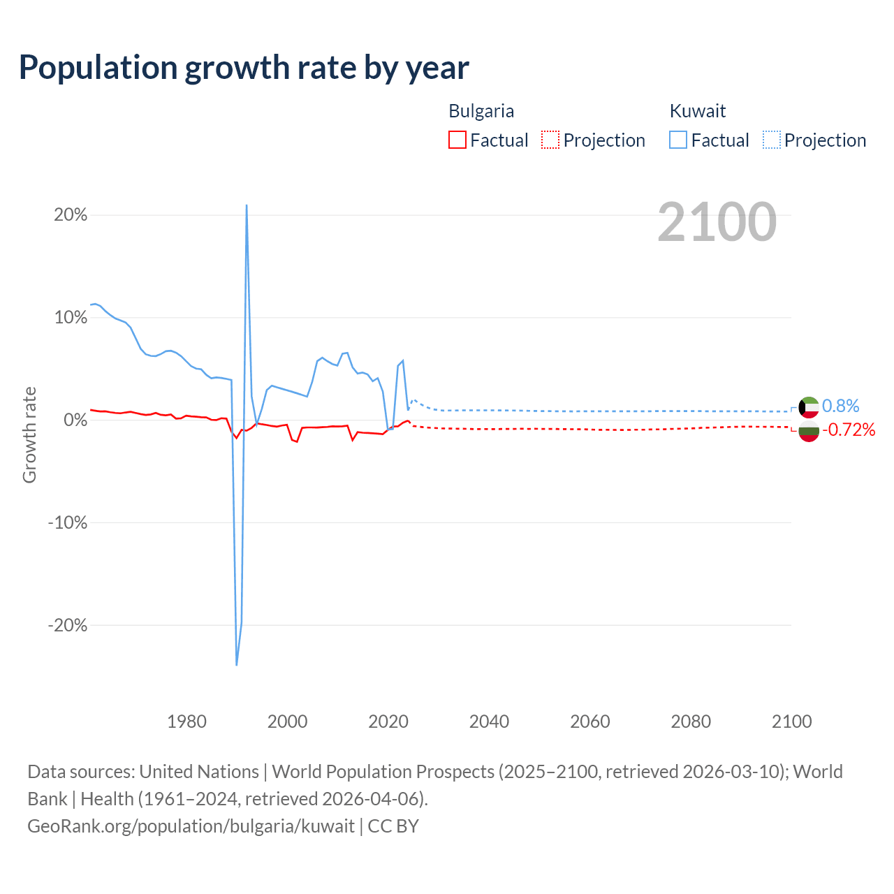 - For the last 10 years, Bulgaria has had an average growth rate of -0.96% per year vs +3.1% in Kuwait.