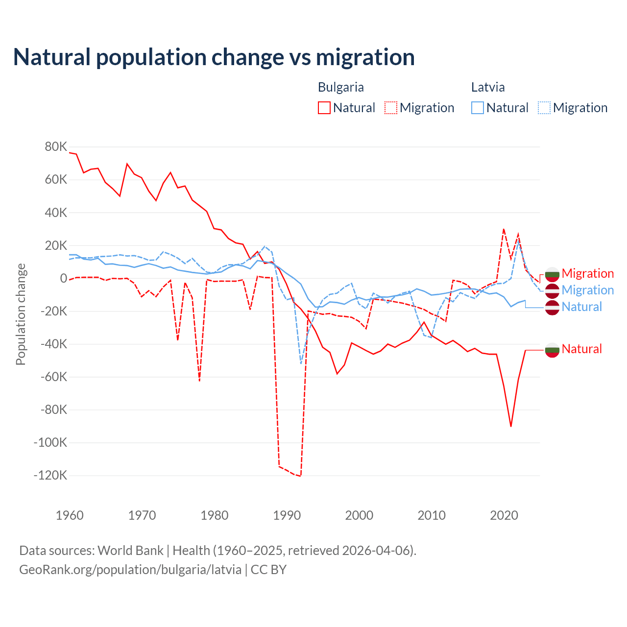 Over the last 10 years, 92.1% of the population change in Bulgaria is from natural causes (a loss of 528,535 people) and 7.94% is from migration (a gain of 45,567 people). In Latvia 82.7% is from natural causes (a loss of 103,711 people) and 17.3% is from migration (a loss of 21,641 people).