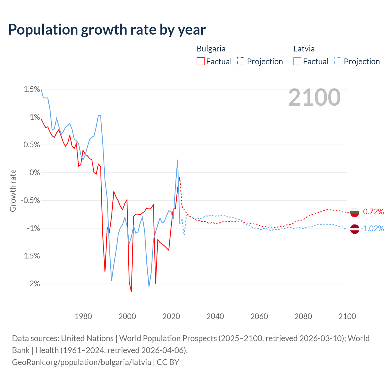 - For the last 10 years, Bulgaria has had an average growth rate of -0.96% per year vs -0.68% in Latvia.