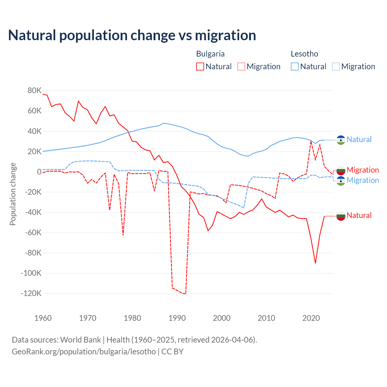 Over the last 10 years, 92.1% of the population change in Bulgaria is from natural causes (a loss of 528,535 people) and 7.94% is from migration (a gain of 45,567 people). In Lesotho 84.2% is from natural causes (a gain of 315,836 people) and 15.8% is from migration (a loss of 59,457 people).