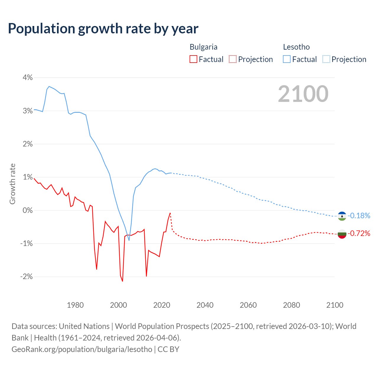 - For the last 10 years, Bulgaria has had an average growth rate of -0.96% per year vs +1.17% in Lesotho.