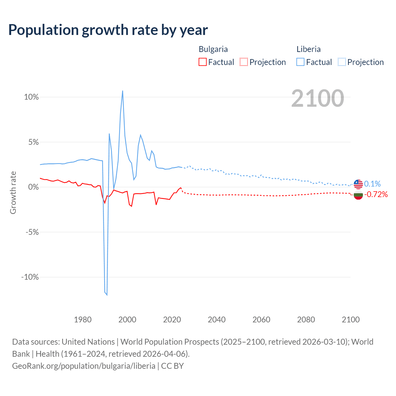 - For the last 10 years, Bulgaria has had an average growth rate of -0.96% per year vs +2.09% in Liberia.