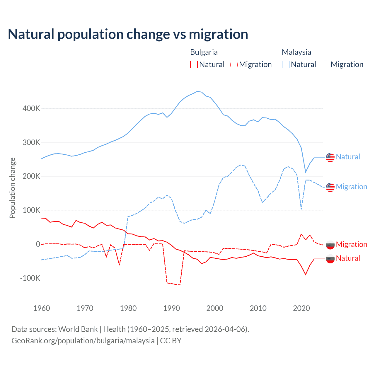 Over the last 10 years, 92.1% of the population change in Bulgaria is from natural causes (a loss of 528,535 people) and 7.94% is from migration (a gain of 45,567 people). In Malaysia 61.7% is from natural causes (a gain of 3,029,648 people) and 38.3% is from migration (a gain of 1,882,159 people).