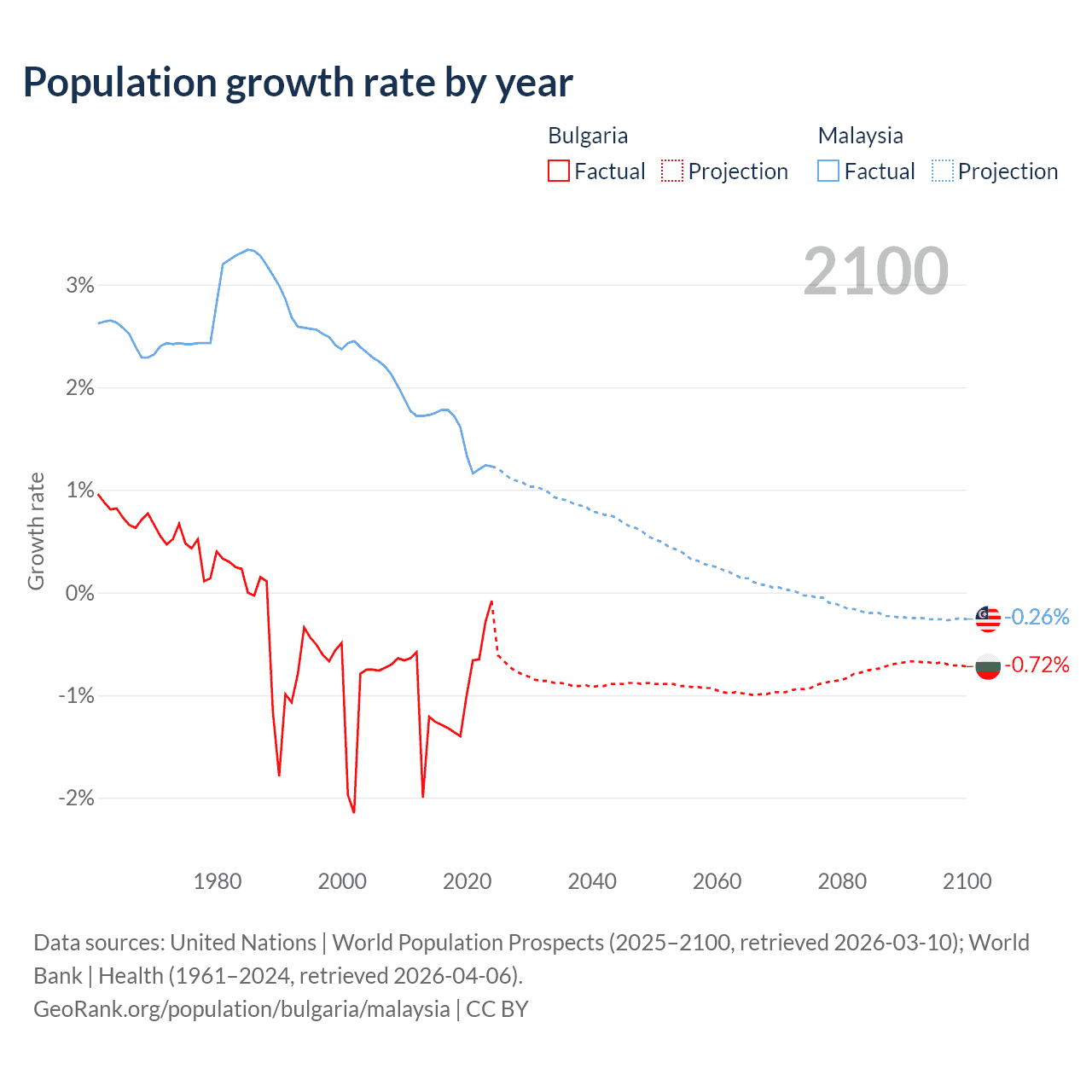 - For the last 10 years, Bulgaria has had an average growth rate of -0.96% per year vs +1.5% in Malaysia.