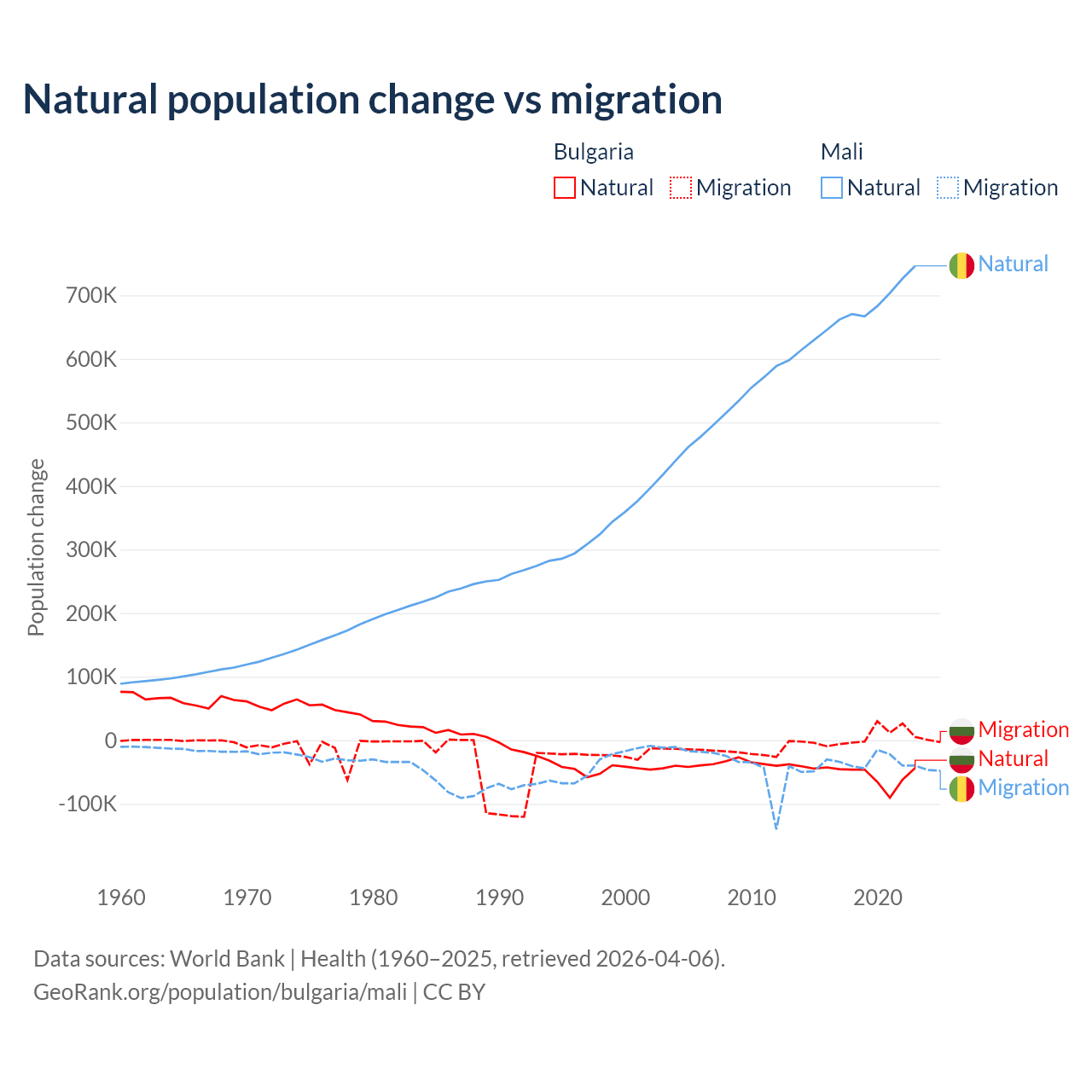 Over the last 10 years, 92.1% of the population change in Bulgaria is from natural causes (a loss of 528,535 people) and 7.94% is from migration (a gain of 45,567 people). In Mali 94.9% is from natural causes (a gain of 6,749,473 people) and 5.13% is from migration (a loss of 365,292 people).