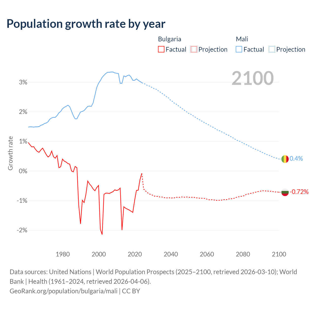 - For the last 10 years, Bulgaria has had an average growth rate of -0.96% per year vs +3.12% in Mali.