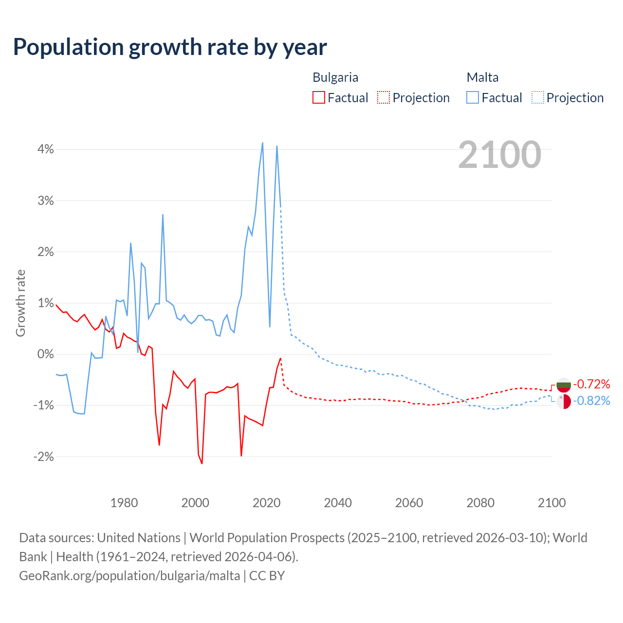 - For the last 10 years, Bulgaria has had an average growth rate of -0.96% per year vs +2.69% in Malta.