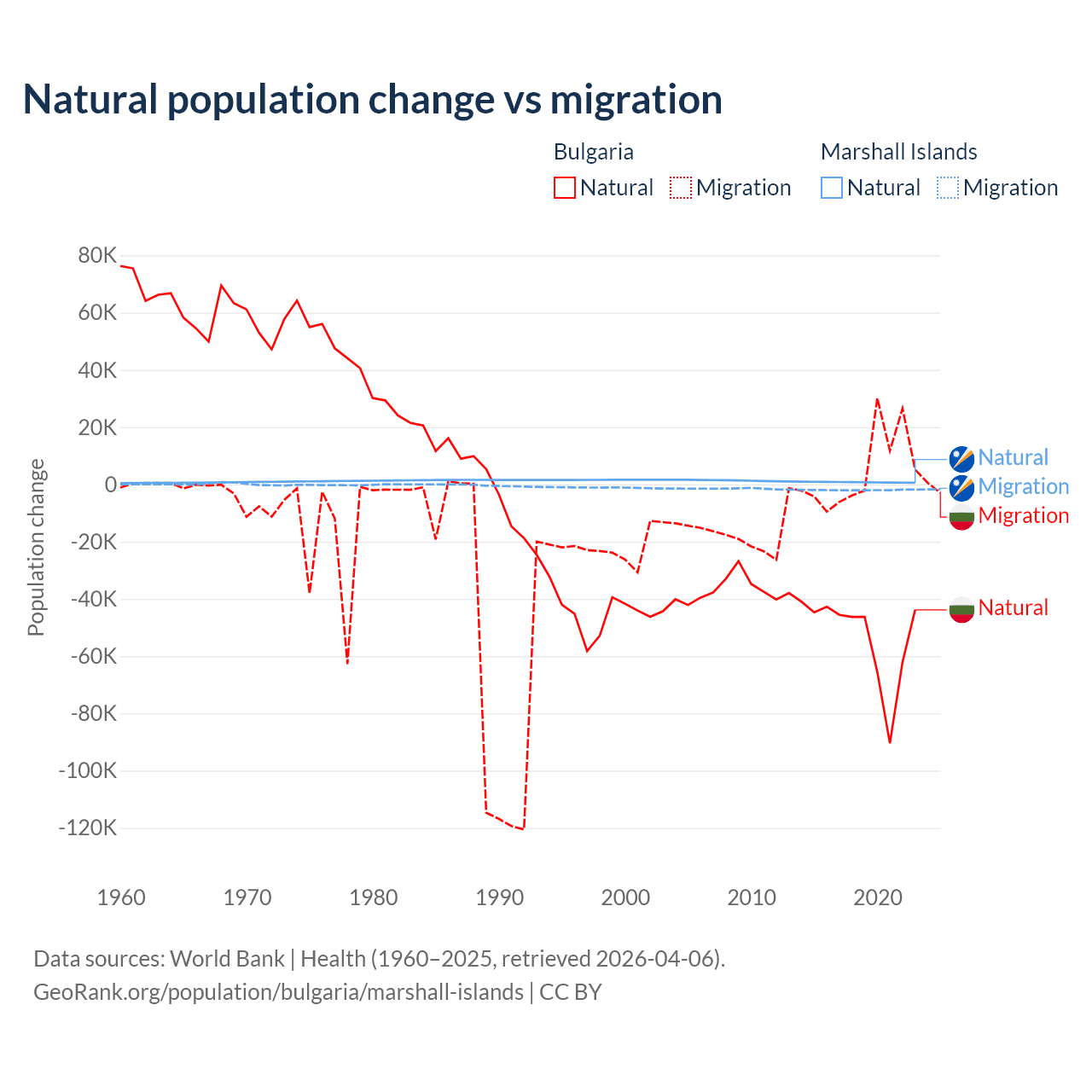 Over the last 10 years, 92.1% of the population change in Bulgaria is from natural causes (a loss of 528,535 people) and 7.94% is from migration (a gain of 45,567 people). In the Marshall Islands 27.8% is from natural causes (a gain of 7,592 people) and 72.2% is from migration (a loss of 19,682 people).