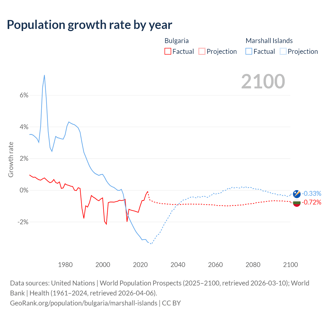 - For the last 10 years, Bulgaria has had an average growth rate of -0.96% per year vs -2.69% in the Marshall Islands.
