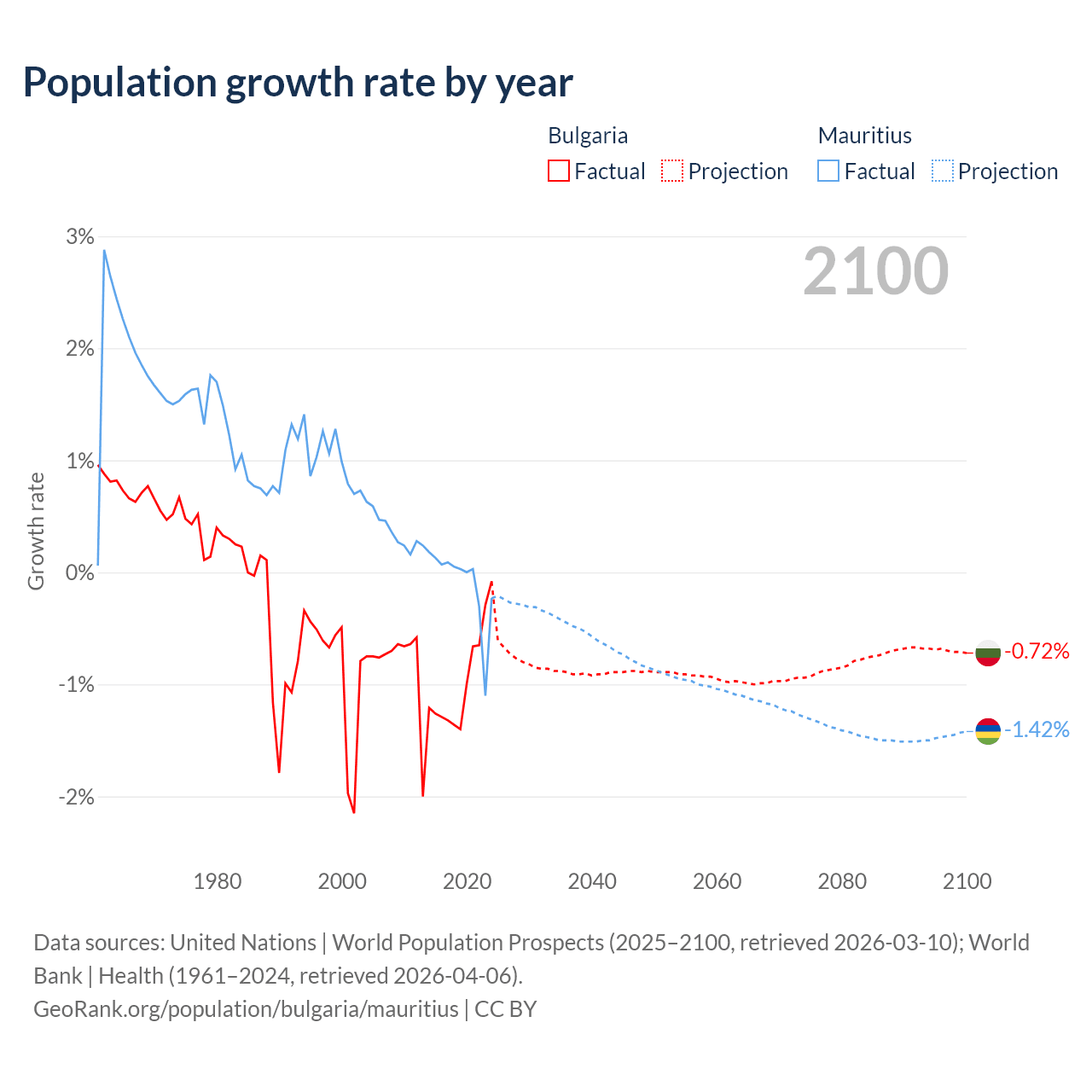 - For the last 10 years, Bulgaria has had an average growth rate of -0.96% per year vs -0.09% in Mauritius.